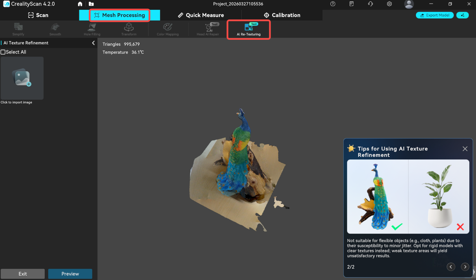 In CrealityScan, open the project that requires AI Re-Texturing. Note: This feature can only be used on projects that have already undergone color mapping processing. Click Mesh Processing → AI Re-Texturing.