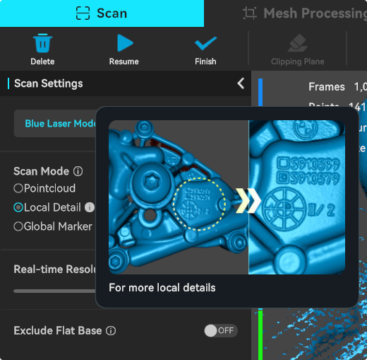 After adjusting the scanning settings and clicking "Preview", you can preview the image and point cloud. At this stage, you can adjust the exposure/laser brightness (in blue light mode).