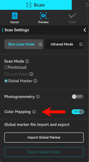 The switch for the blue laser line color mapping function has been moved to the global marker scanning section.