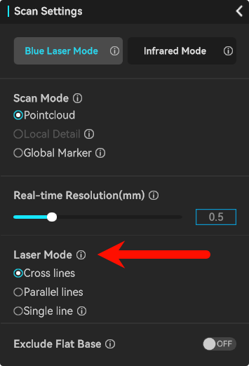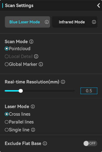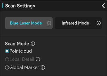 Select either the blue laser mode or the infrared mode for scanning. The choice should be determined based on specific scanning requirements and the characteristics of the object.