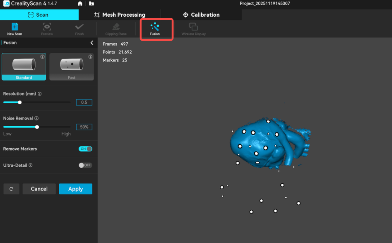 Click "Finish" to end the scanning process and enter the "Fusion" processing stage.