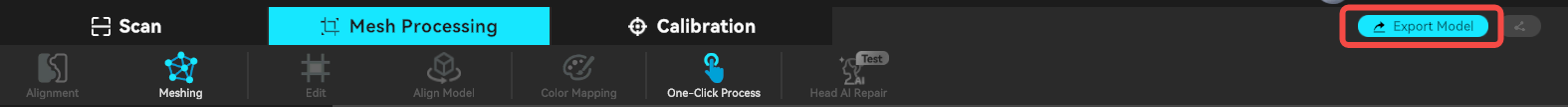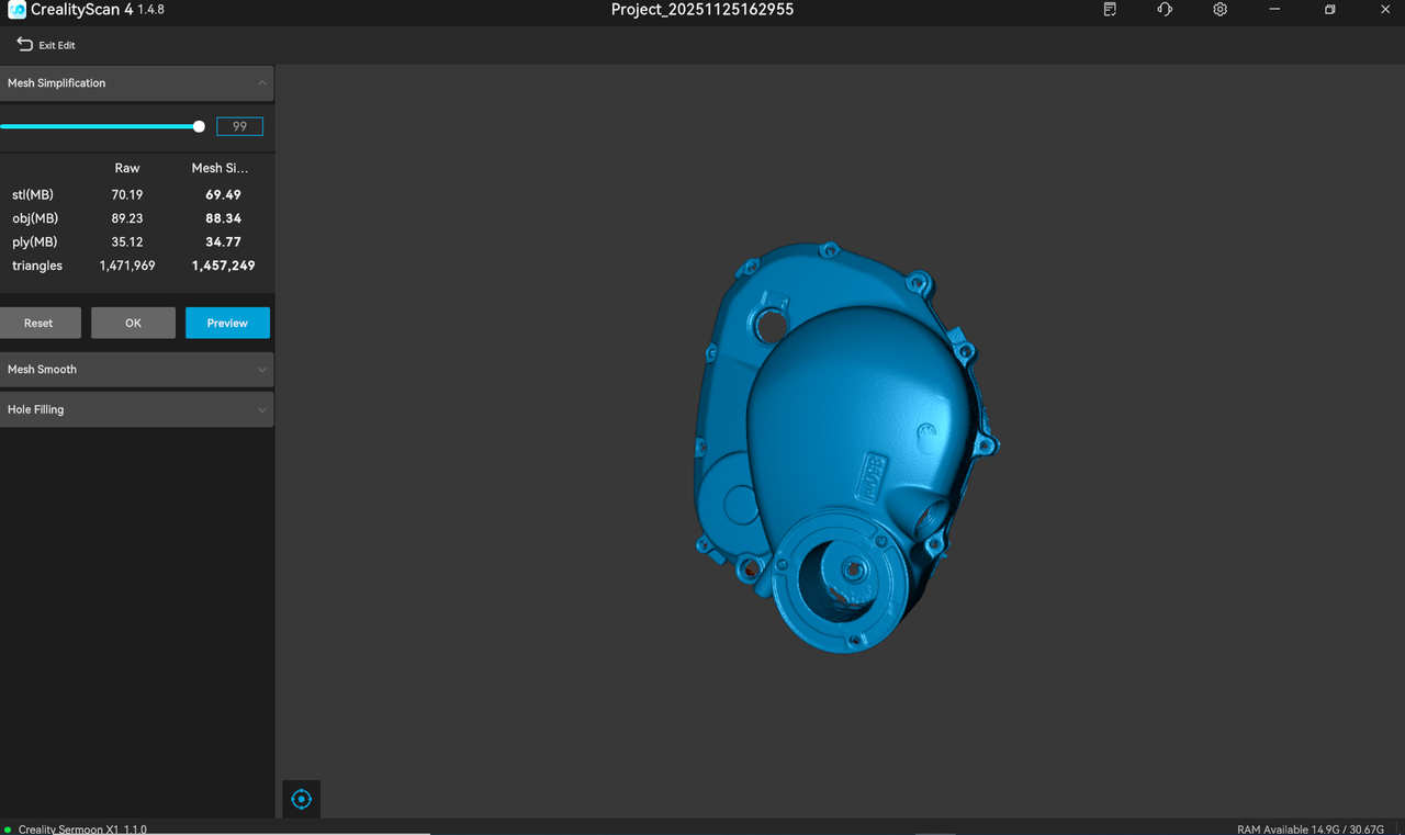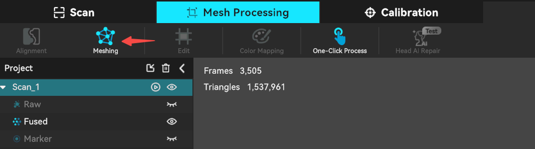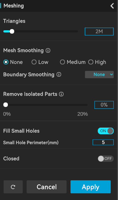Map the scanned 3D point cloud data to the mesh. Users can customize parameters, including setting the maximum number of faces, smoothness level, whether to fill holes, whether to remove markers, and whether to close the mesh.