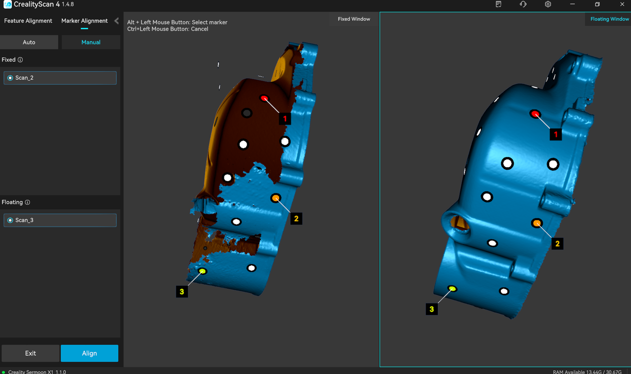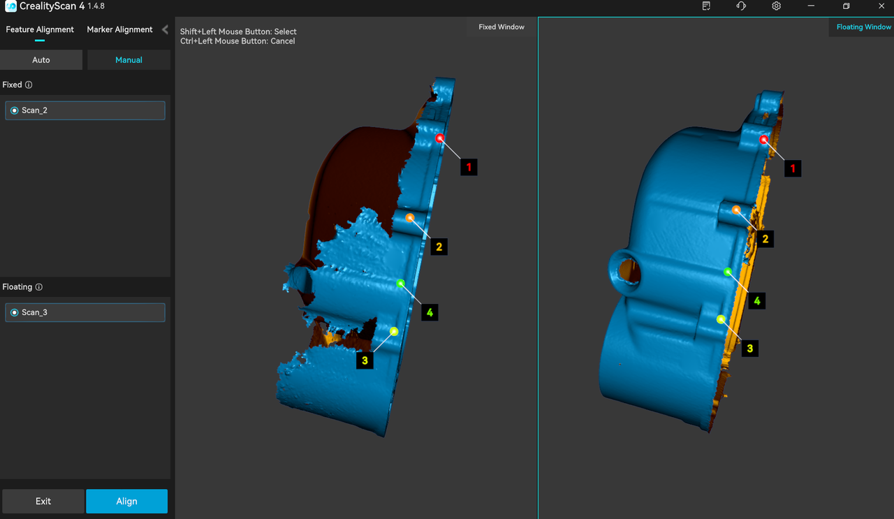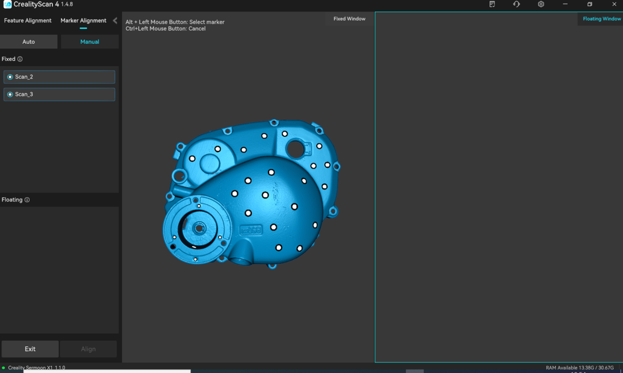 The left sidebar displays the Fixed Window List and Floating Window List respectively. In the Manual Marker Stitching mode, you can select one target sub-project from each of the two lists on the left, and display them in the corresponding Fixed Window and Floating Window, and select at least three pairs of matching markers on the models in the Fixed Window and Floating Window.