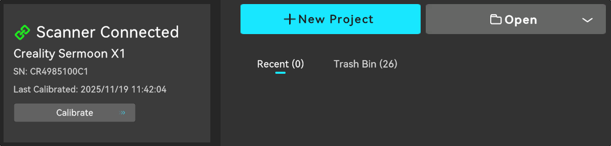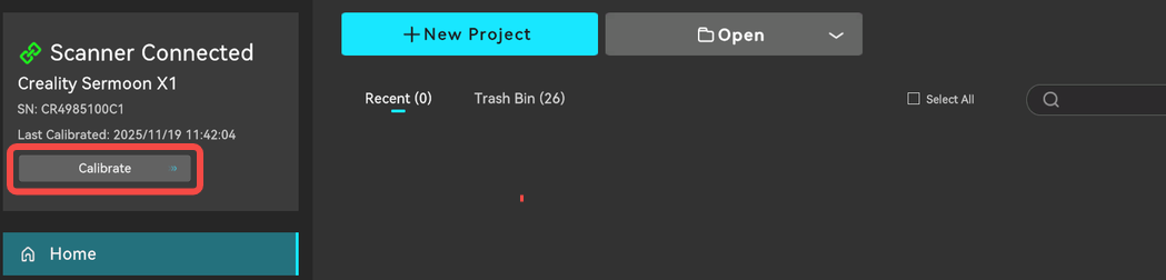 Check if the scanner is connected successfully in the information panel on the left side of the homepage; After connected the scanner, the information panel will display the basic device information and allow access to the calibration page.