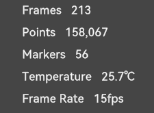 | Current Status Display: The upper left corner shows the number of frames collected so far, the number of historically collected points, the current device temperature of the scanner, and the acquisition frame rate. The lower left corner displays the model, firmware, and scanning configuration, while the lower right corner displays the available memory. |