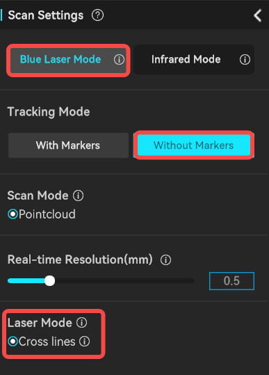 The current Blue Laser markerless scanning feature is more focused on improving the scanning experience and smoothness. The official recommended resolution settings are as follows: