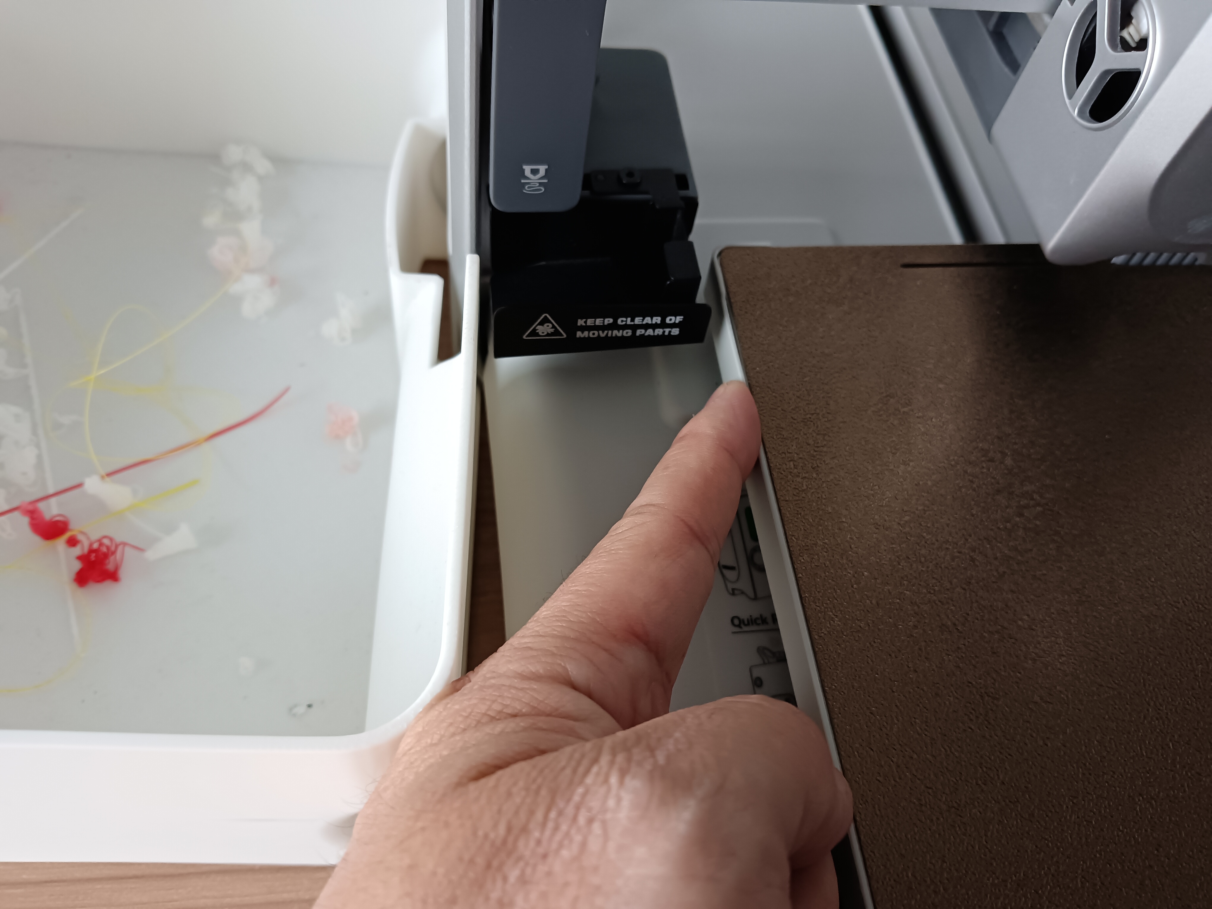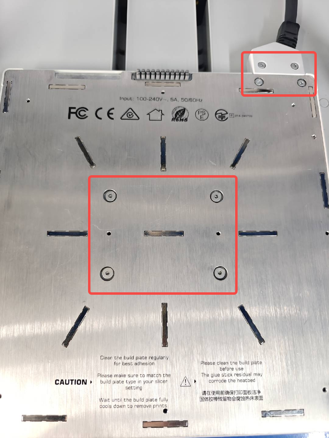 2. During printing, if there is abnormal noise, press the plastic edge trim of the hot bed with your hand to see if the noise decreases. If the noise decreases, the resonance is coming from the hot bed's plastic trim. In this situation, retighten the fixing screws on the hot bed, place several pieces of double-sided tape inside the plastic trim to secure it, then test print again.