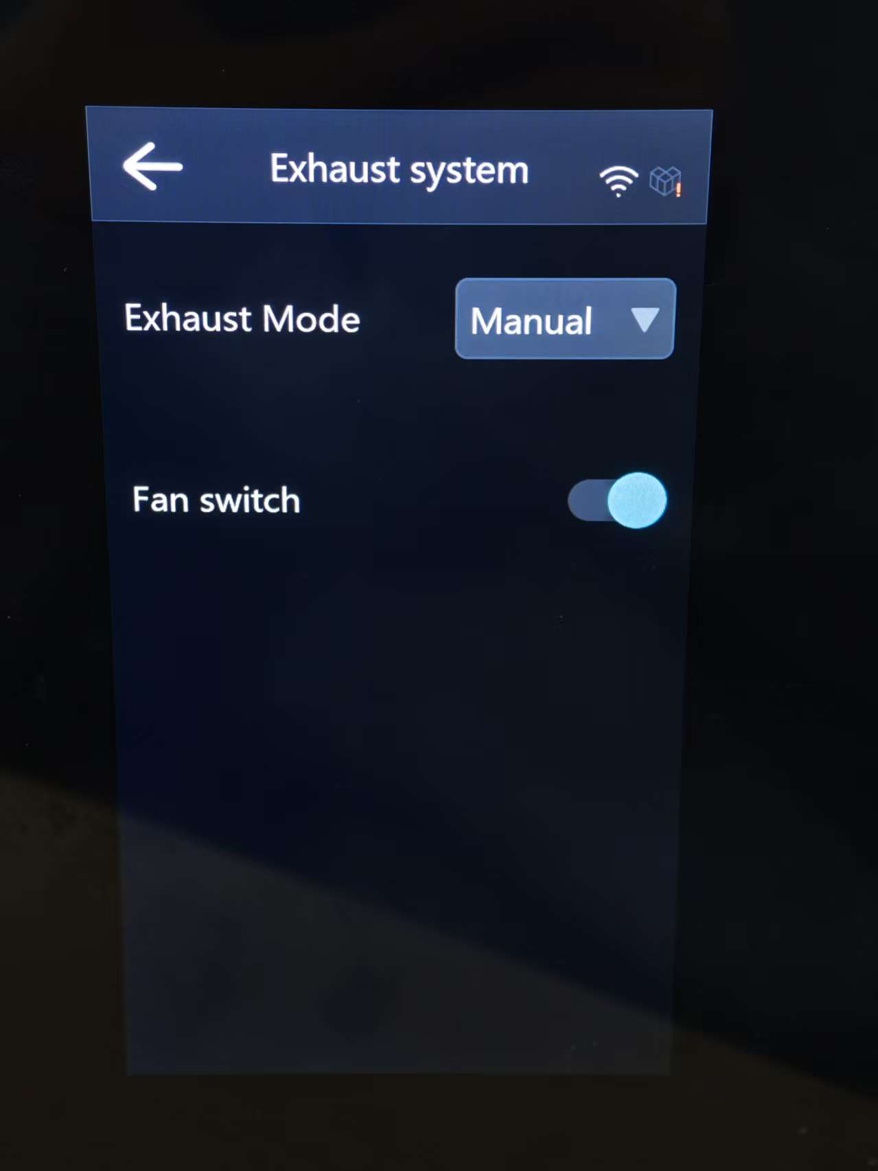 ⑵. Auto: Allows you to set the exhaust duration to minutes (min). When enabled, the exhaust system will automatically operate for the specified time after printing to purify the air inside the chamber.