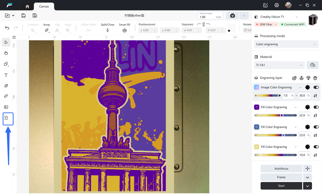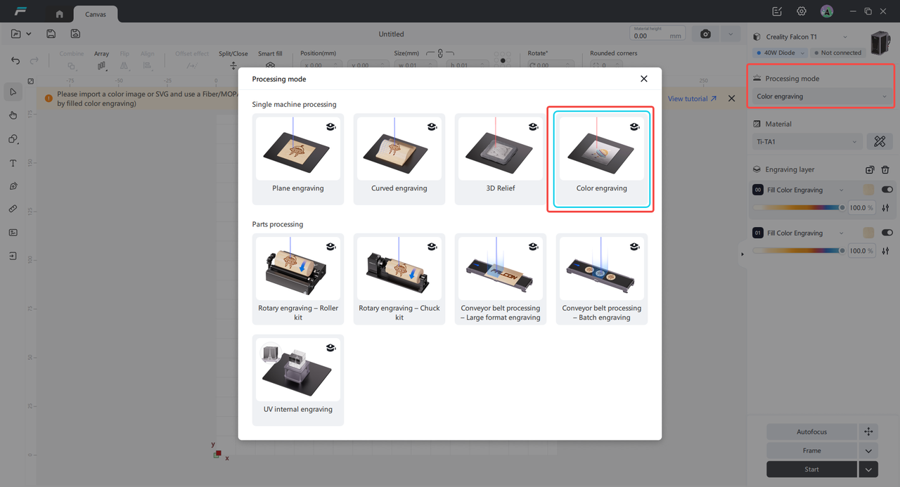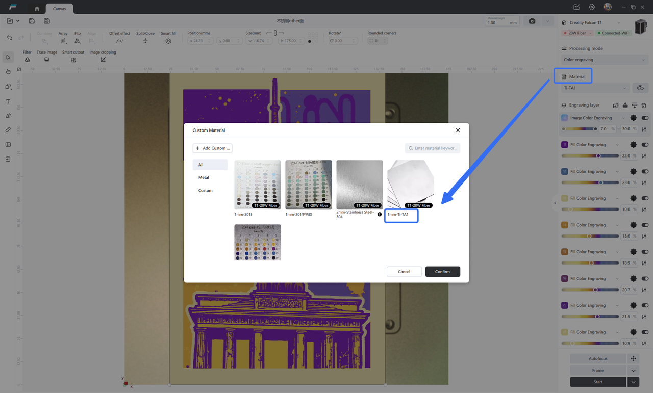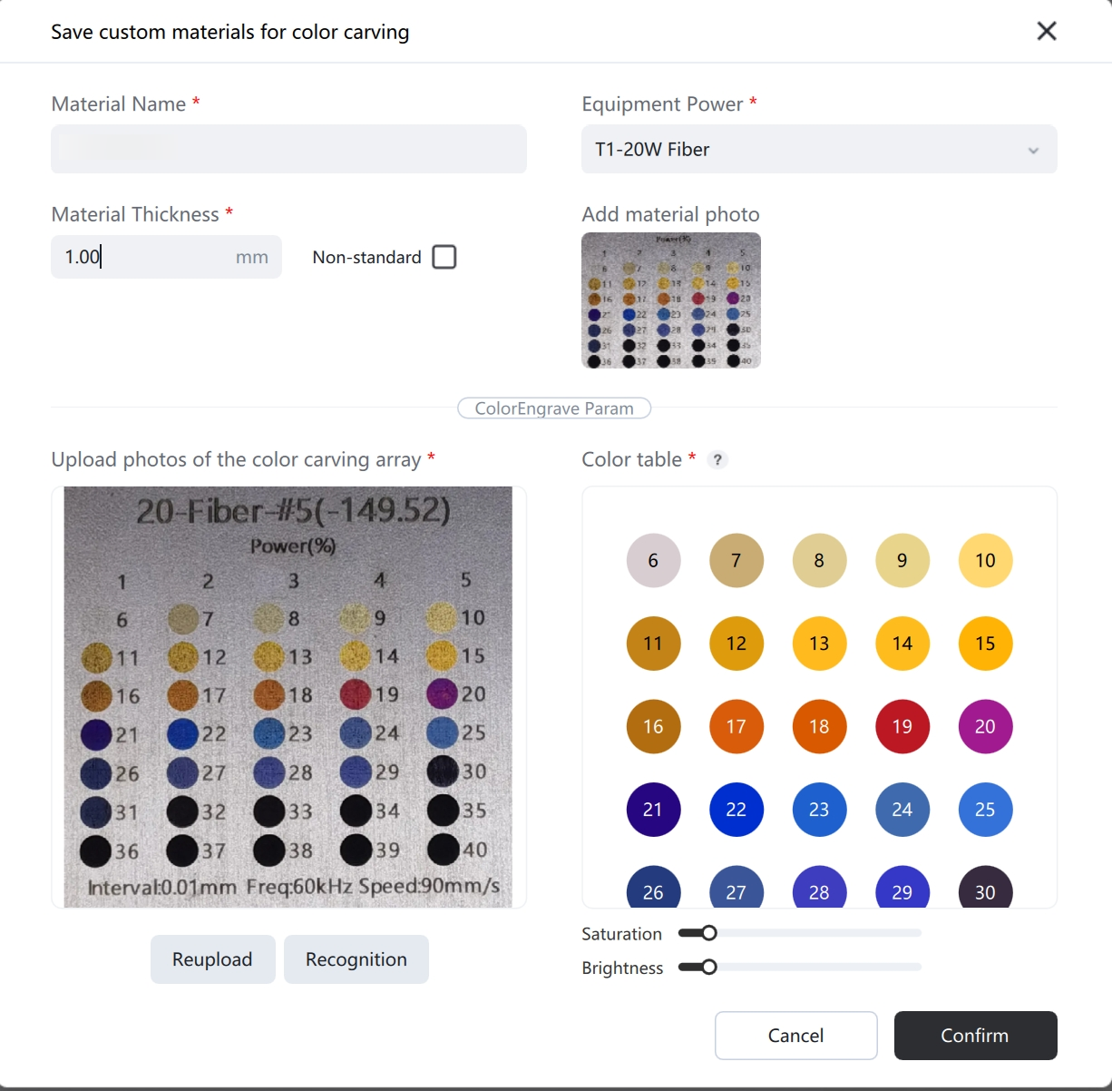 Color deviation explanation: The colors of color engraving are very sensitive to power deviations and focal length deviations of different materials and different lasers. It is normal for there to be slight deviations between the colors displayed on the canvas and the actual engraved colors. If you need to achieve precise color matching, you need to test on your own and add custom material parameters for color engraving.