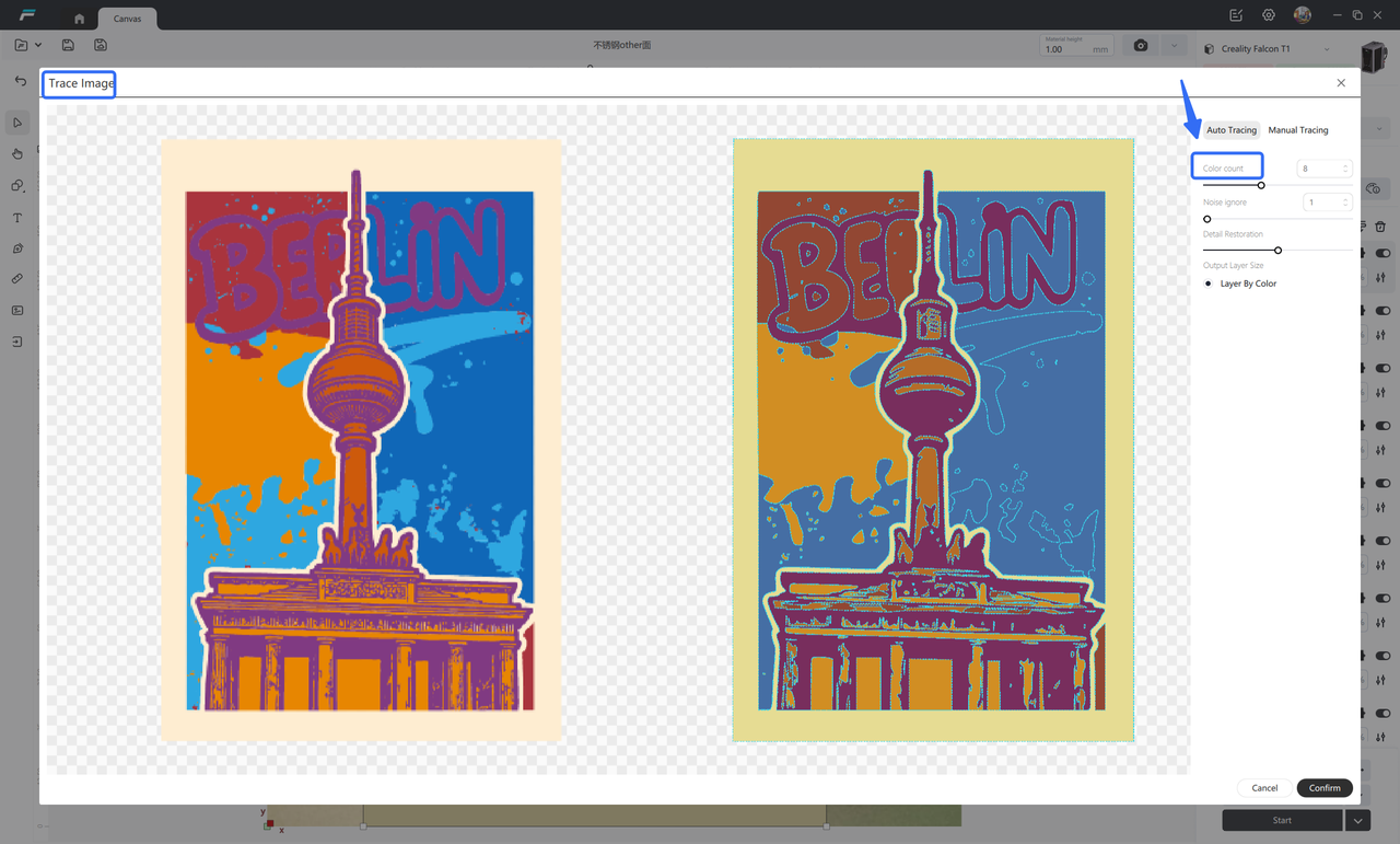 Image Color Engraving: Read the image and convert it to a canary release, then map the canary release to the engraving power based on the power range selected from the material color table.