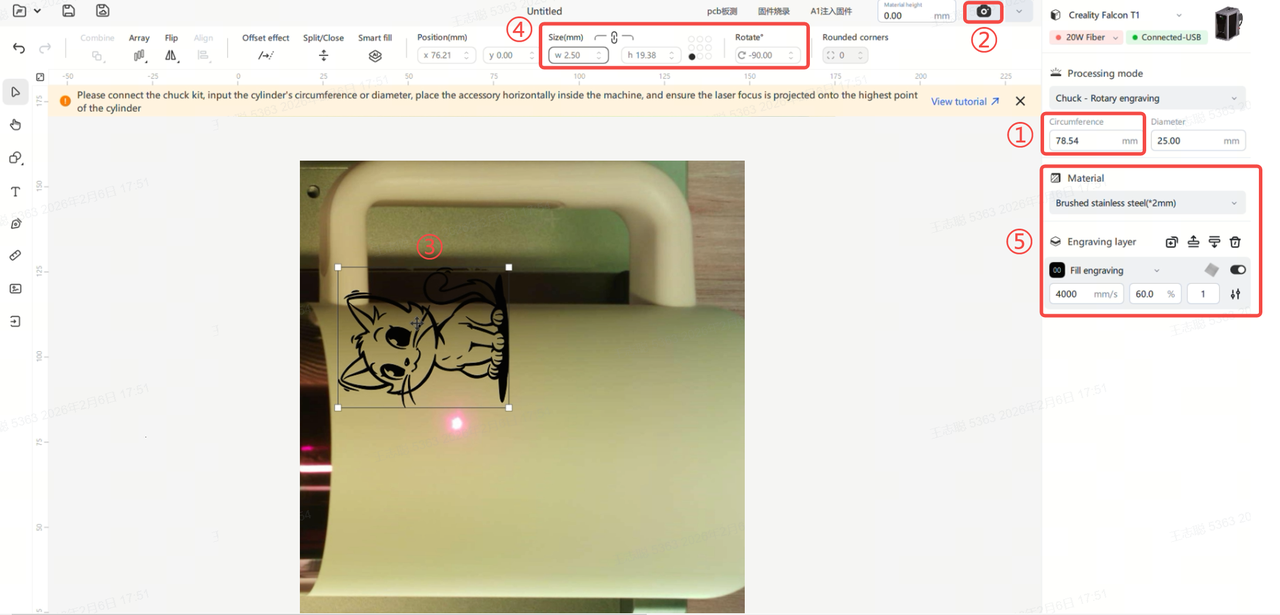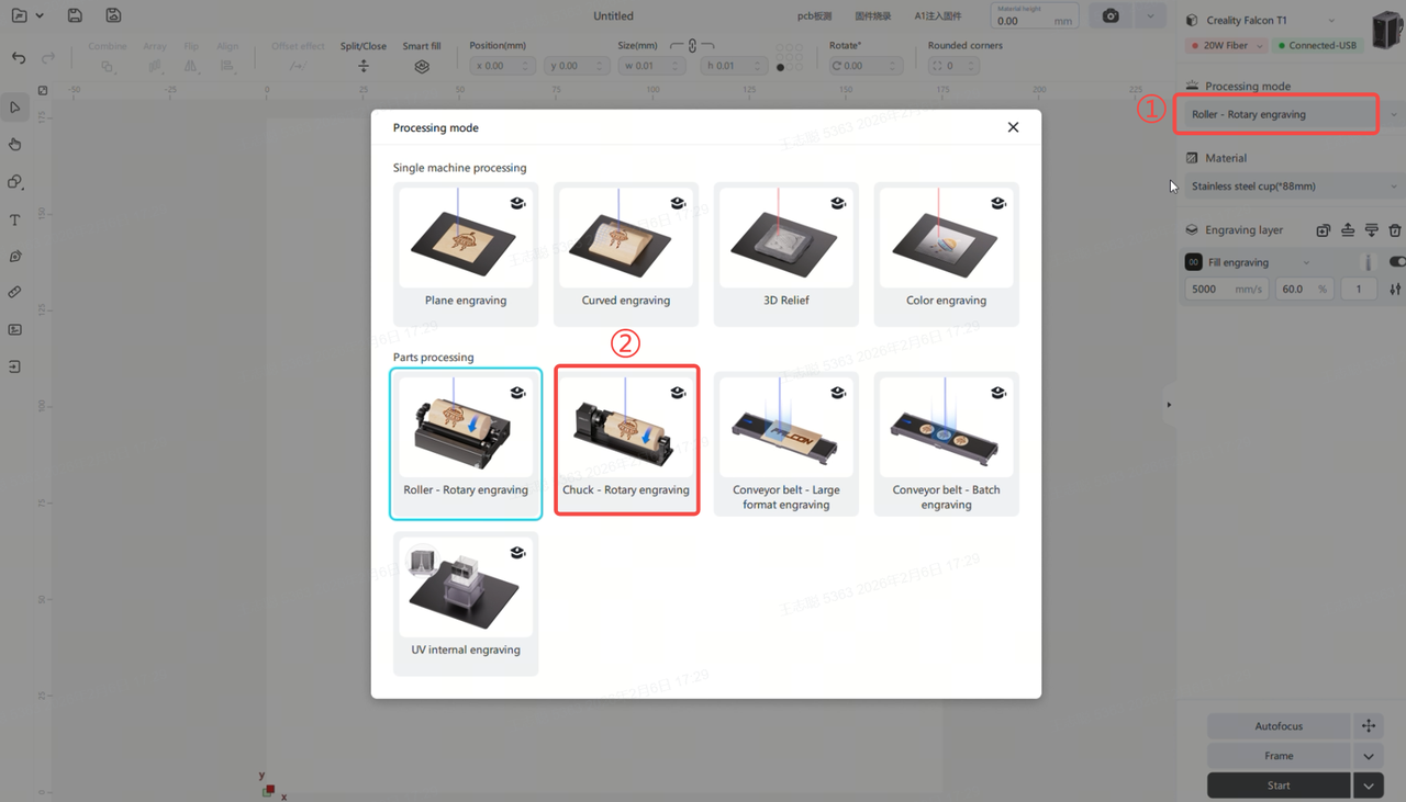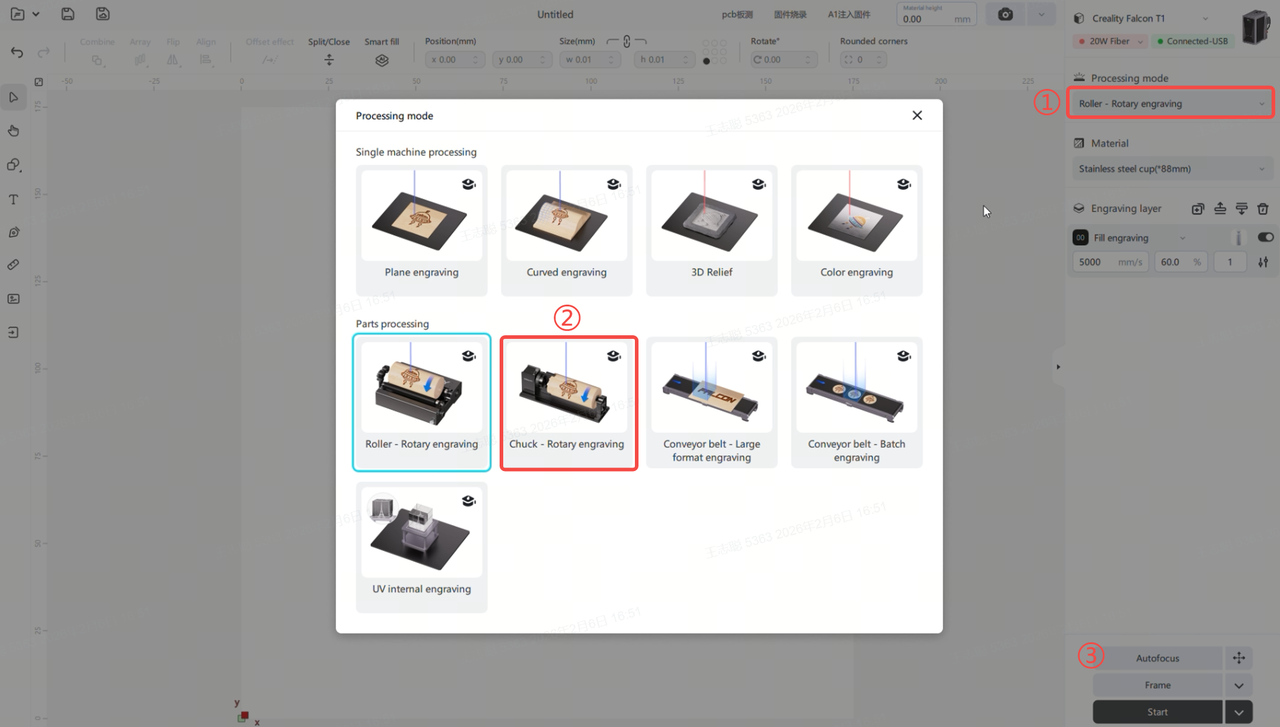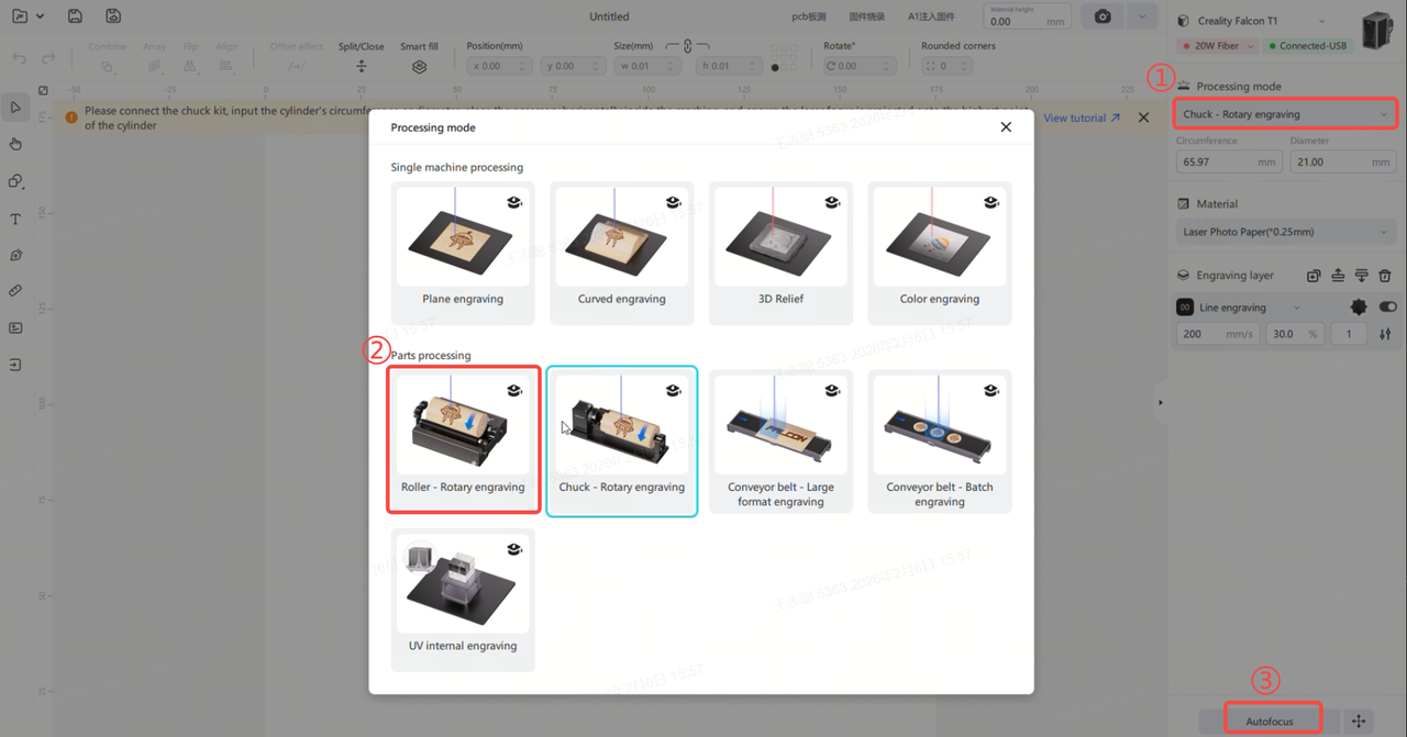 Open Falcon Design Space, connect to T1. Then select Chunk-Rotary Engraving in Processing Mode, and then click Auto Focus.