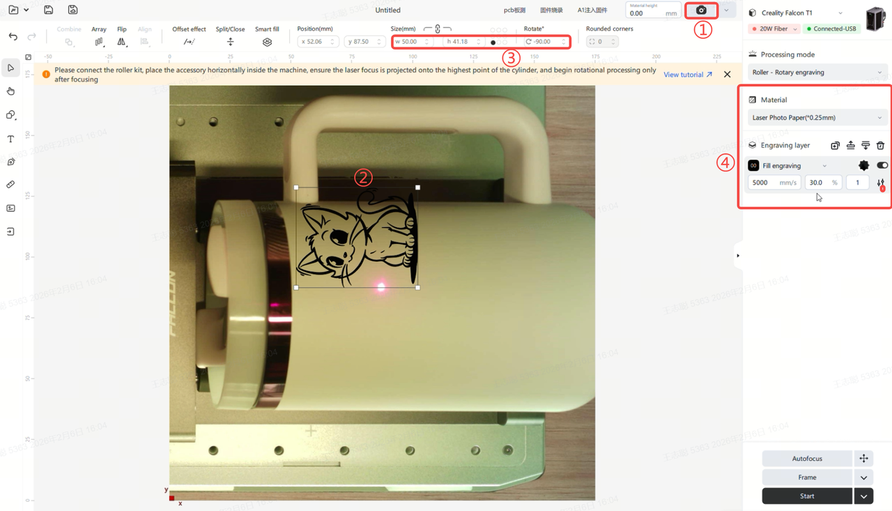 Open Falcon Design Space, connect to T1. Then select Roller-Rotary Engraving in Processing Mode, and click Auto Focus.