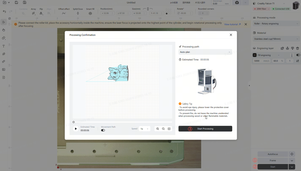 Click on Frame, observe whether the carving area of the water cup meets the expectations. If there are no issues, click Start to begin carving.