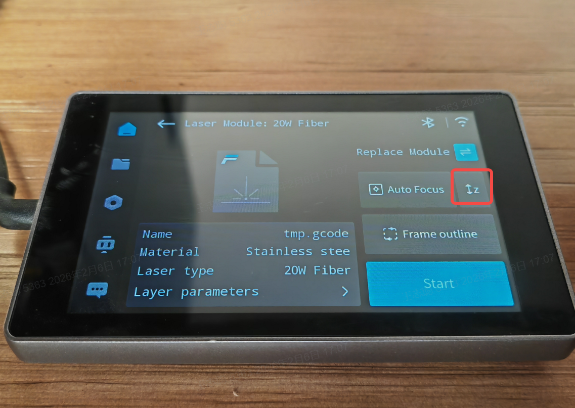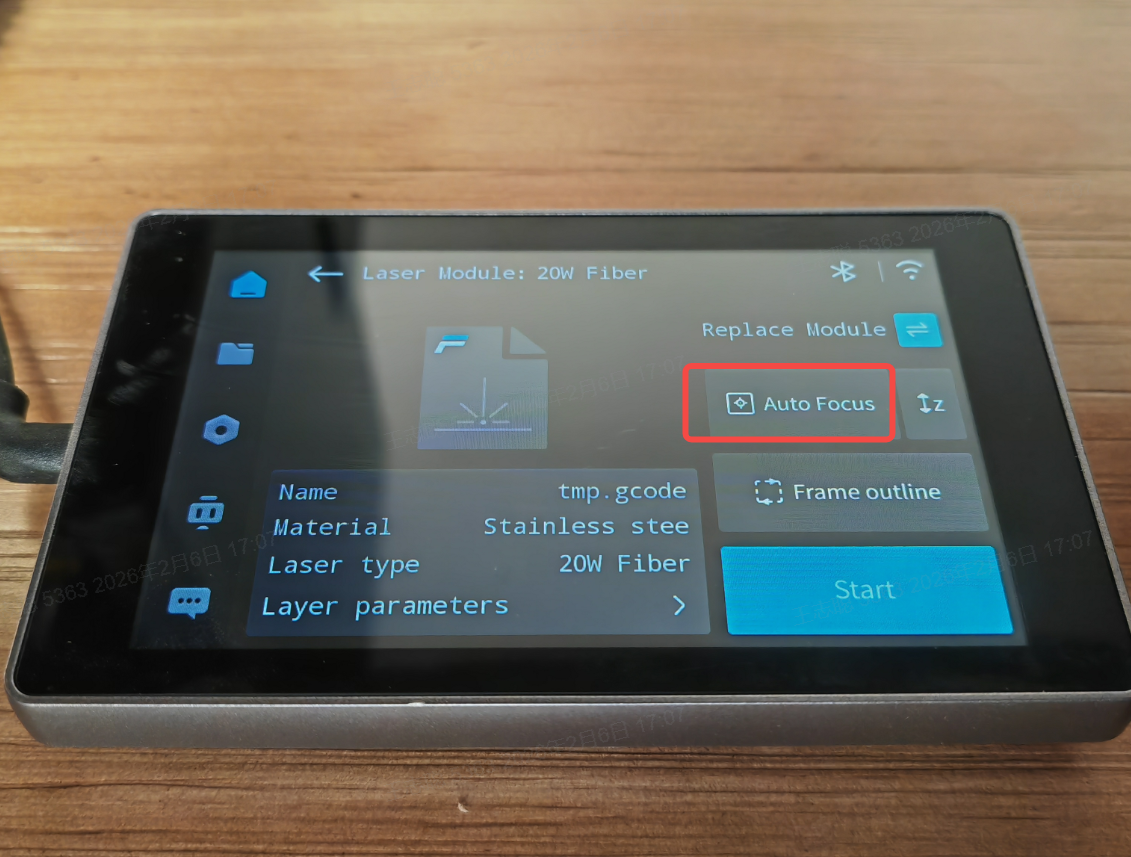 Use the T1 screen to click Auto Focus to make the laser focus on the chuck base plate.