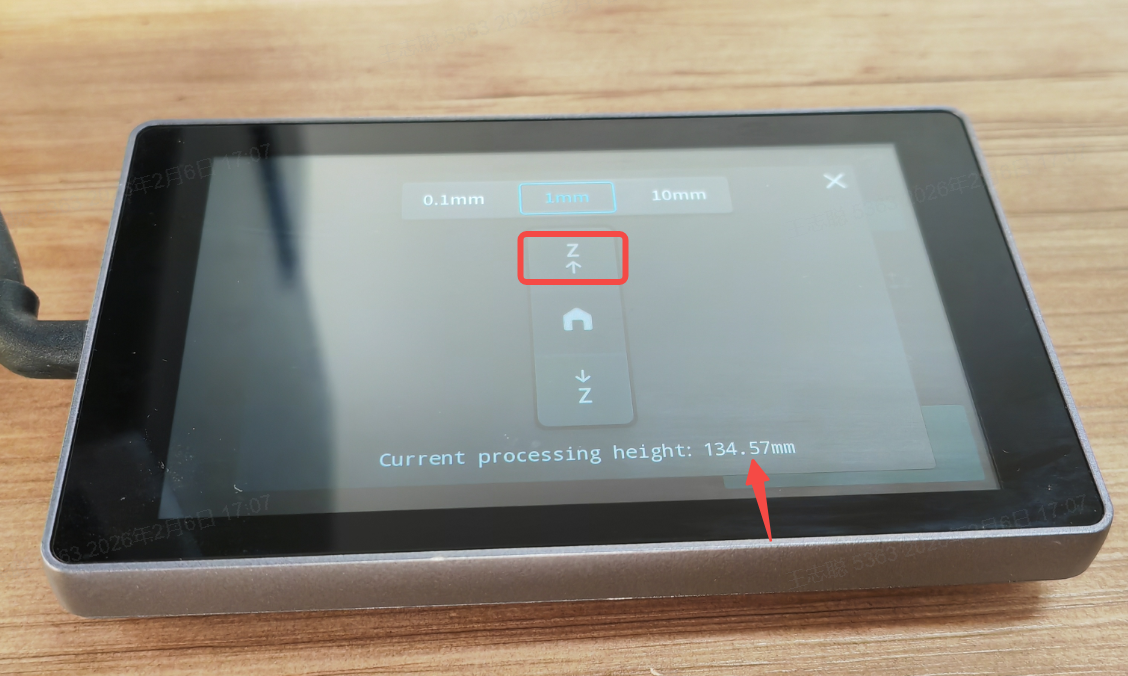 Click Z on the screen, record the value of Current processing height, e.g., 6.61mm.