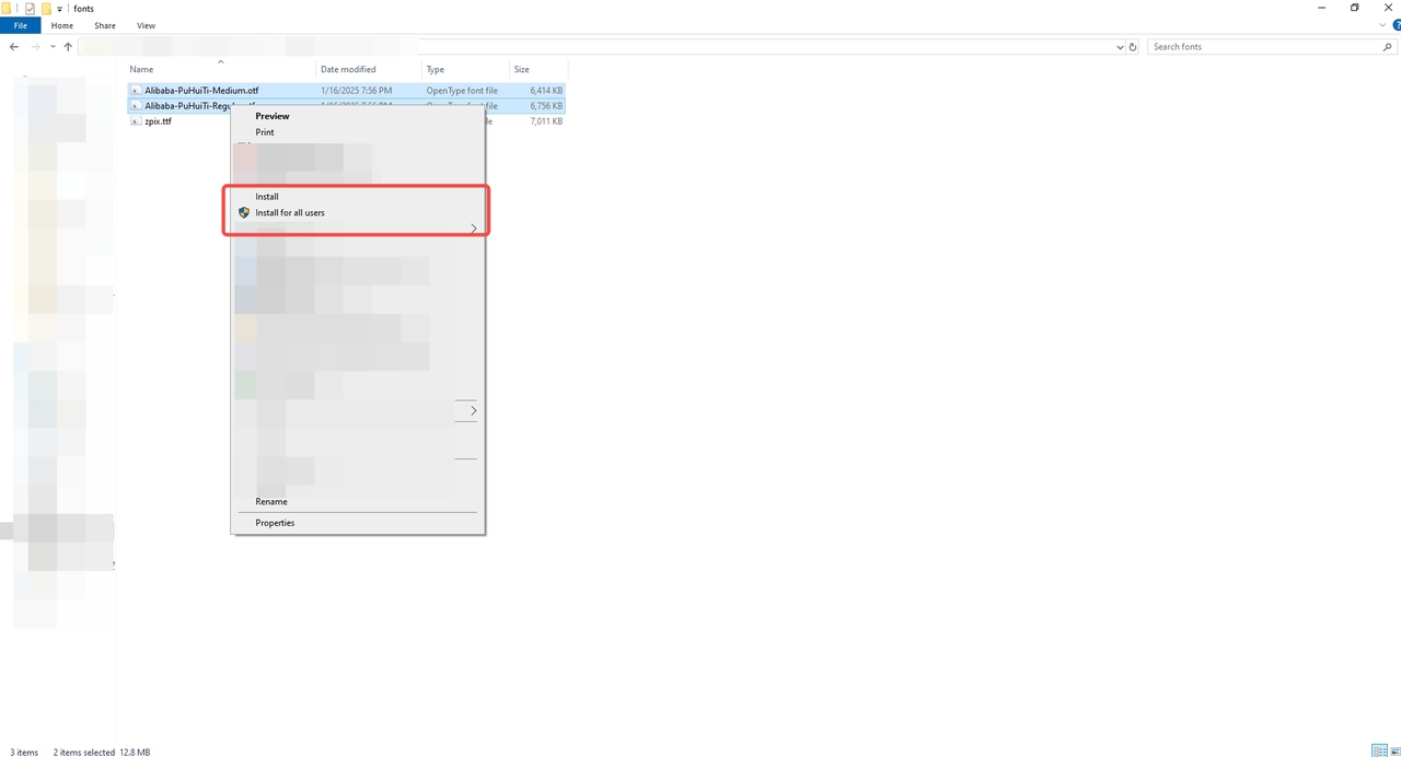 Locate the extracted font files (with extensions .ttf, .otf, .ttc). You can select a single file or hold the Ctrl key to select multiple font files.