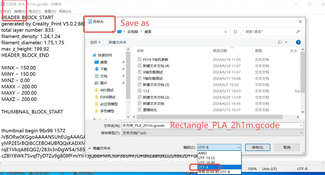 When modifying gcode, use UTF-8 encoding format; If the encoding format is non- UTF-8, you can use the Notepad tool to convert to UTF-8.