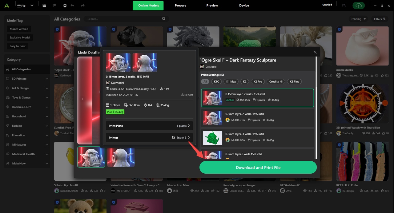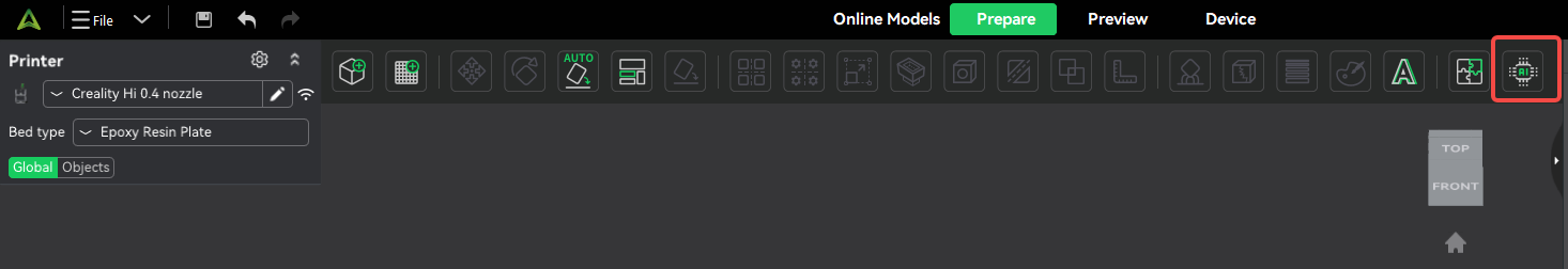 A new Online Models entry is available in the top bar, enabling one-click access to the Creality Cloud model library.