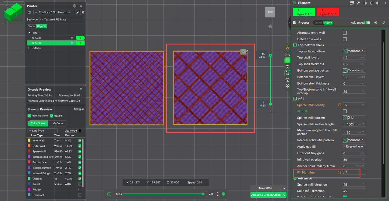 Fill Multiline improves part strength, stability, top surface quality, and reduces vibration by coordinating more paths working together. It is a more stable and reliable internal structure than traditional single-line infill.