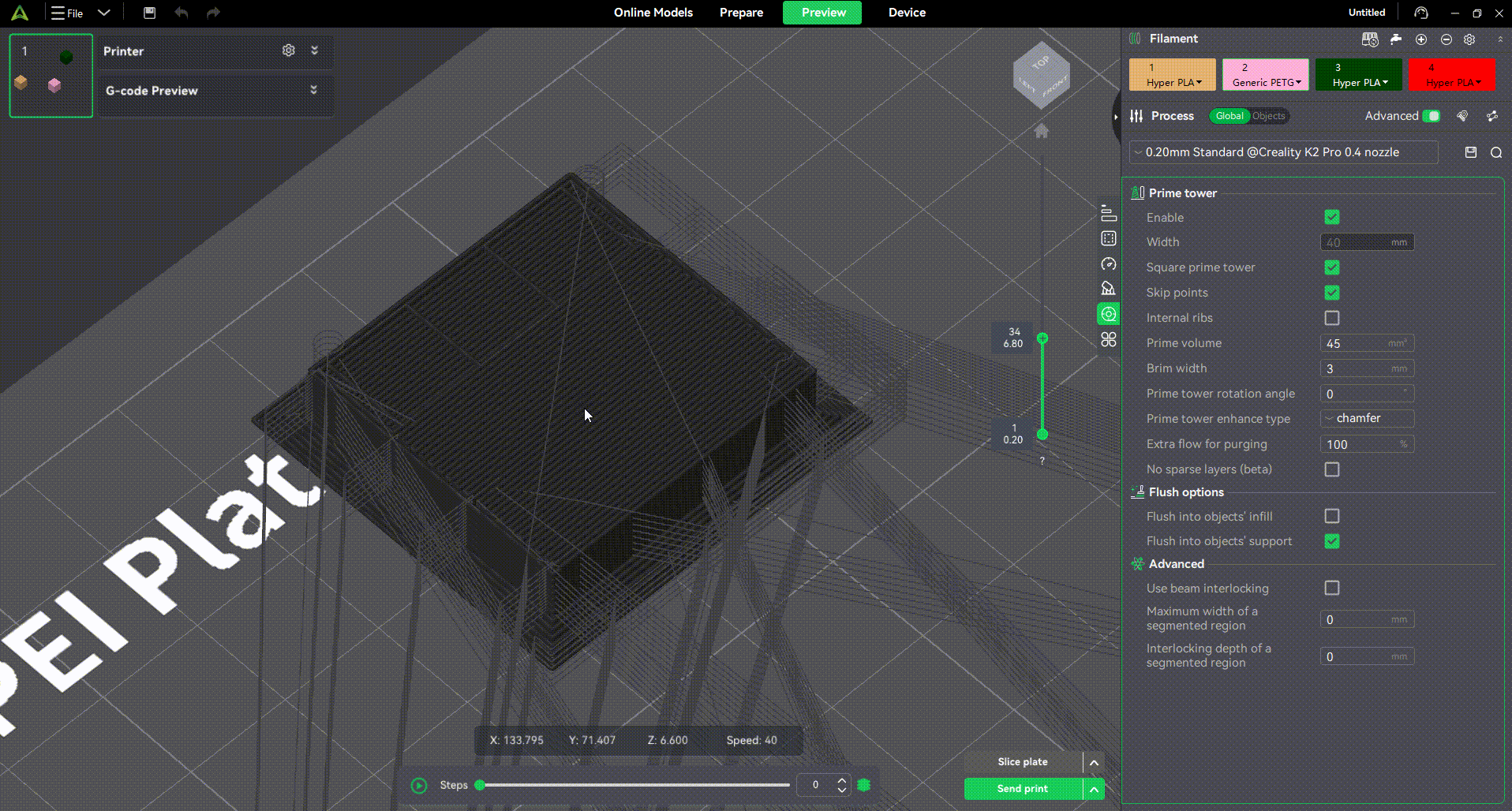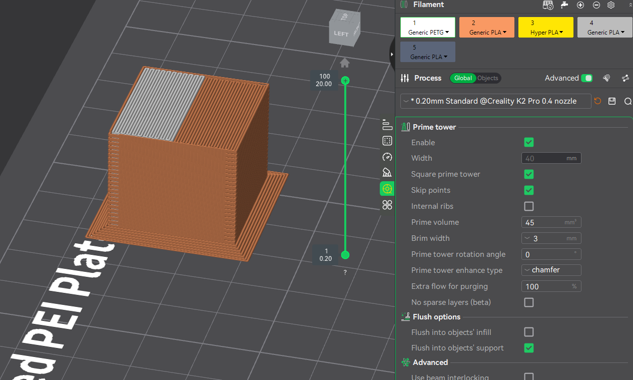 After slicing is completed and returning to the Prepare page, the exact position and geometry of the Prime Tower are shown, allowing users to accurately control its placement.