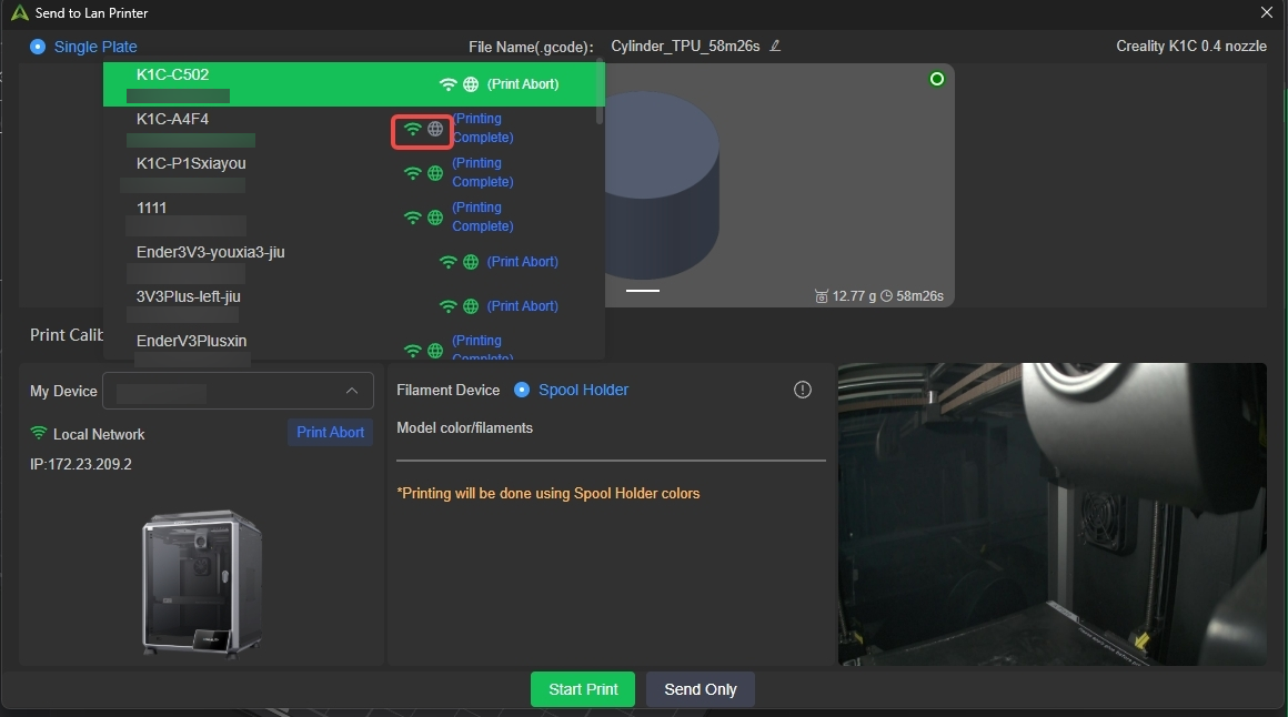 For wide-area network transmission scenarios, the print-sending interface in Creality Print has been upgraded with the following improvements:
