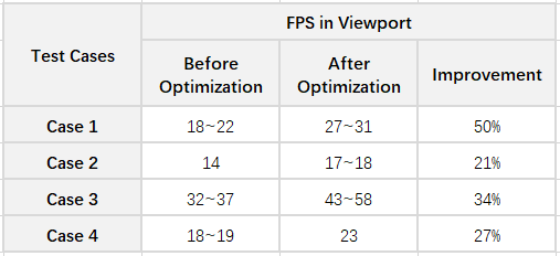 Across common preview scenarios, average framerate improved by 20% or more in internal testing. Using the small dinosaur case as an example, the frame rate improved by up to 24% after optimization.