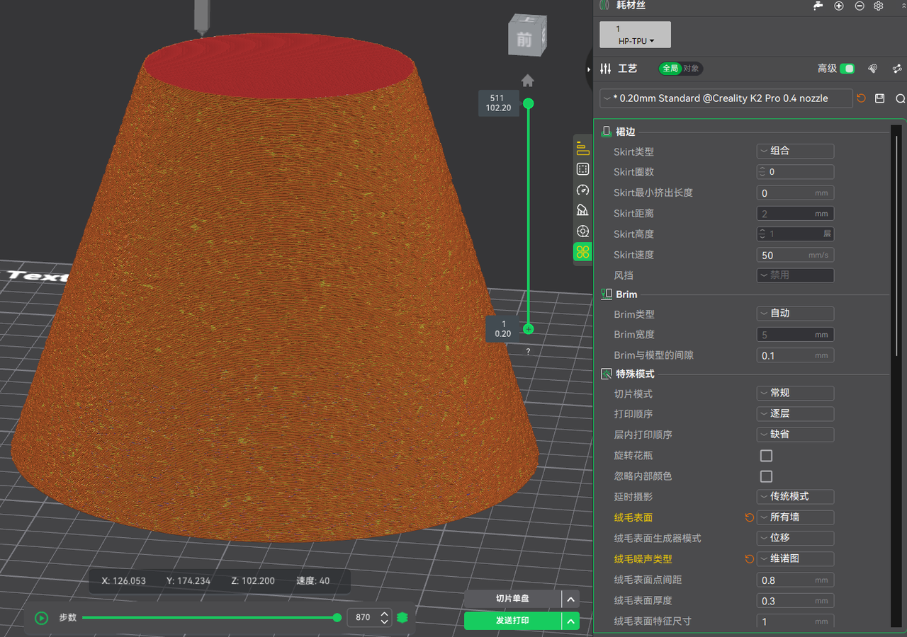 In this update, the existing algorithm has been improved through engine-level optimization of seven key parameters, including:Pressure Advance, Flow smoothing, Deceleration speed, Overhang speed, Melt chamber temperature, Under-extrusion duration, Acceleration.
