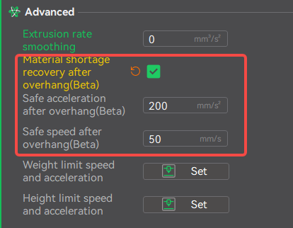 This feature can be enabled under: Process Settings → Speed → Advanced → “Material shortage recovery after overhang(Beta)” It is currently recommended to use the default system parameters.