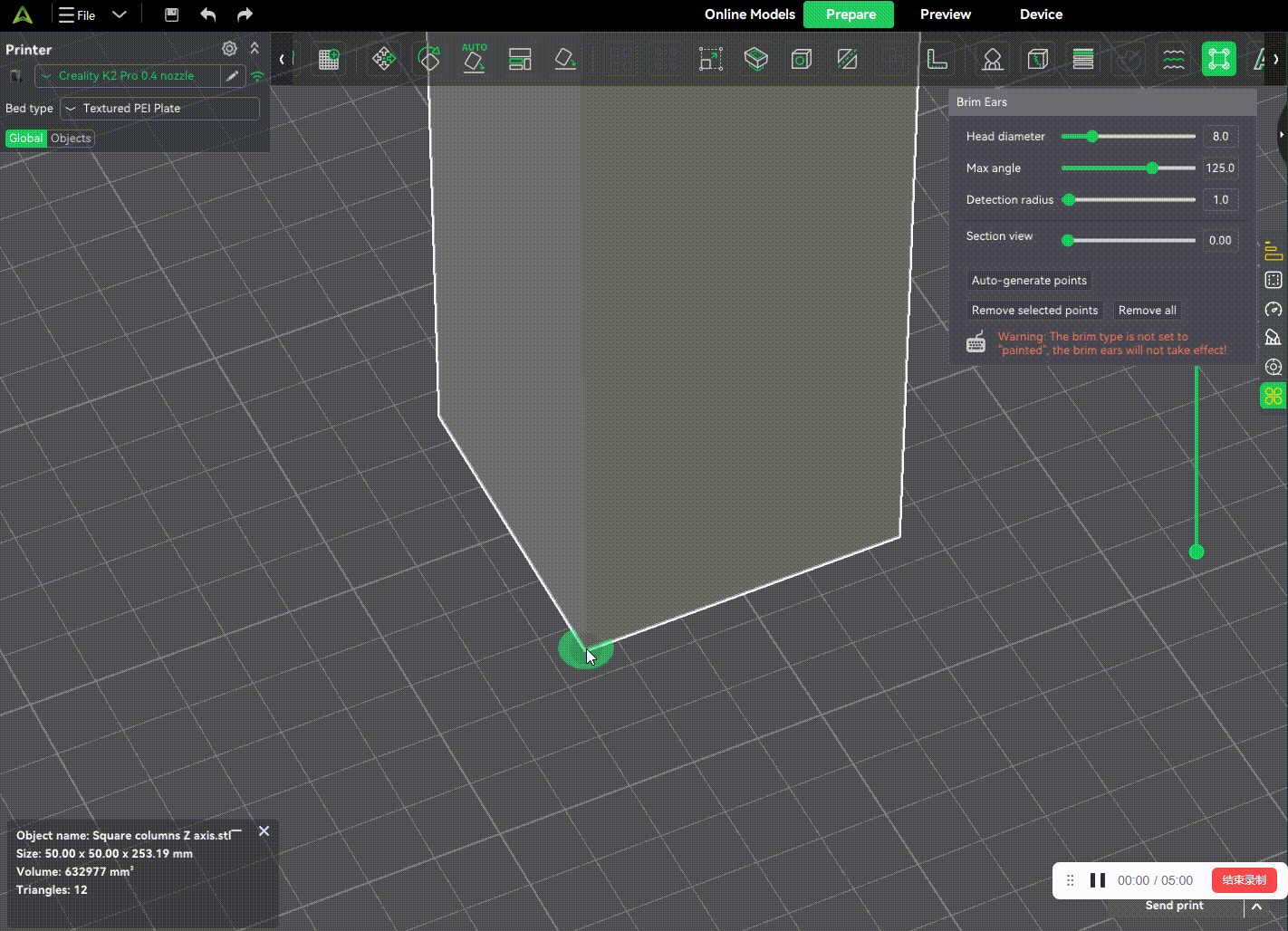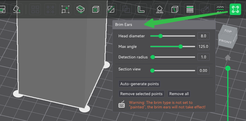 Supports freeform drawing of localized adhesion structures (“ear-shaped brim”) at model edges.