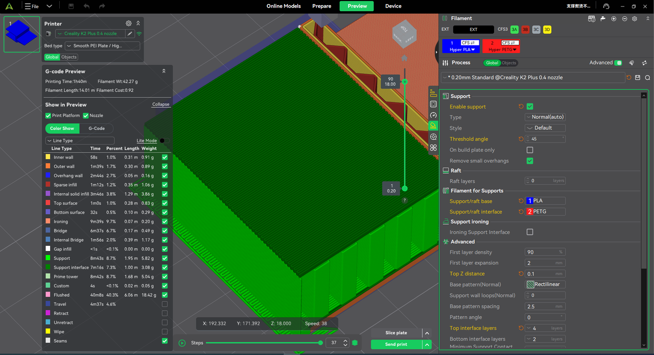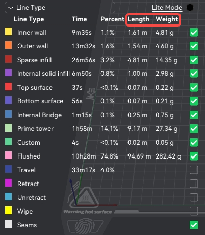 The preview interface now displays filament usage (length/weight) for each path type, enabling better cost estimation and parameter tuning.