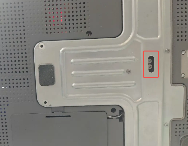 The Y-axis belt tensioner is located on the chassis beneath the heated bed. Move the heated bed to the rear to access it, then remove the protective cover to expose the two tensioning screws.