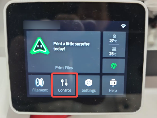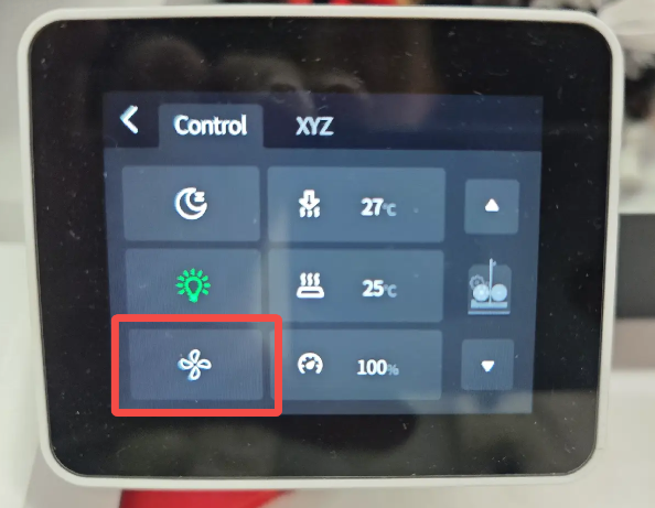 On the printer touchscreen, go to the Device Control page and select Part Cooling Fan.