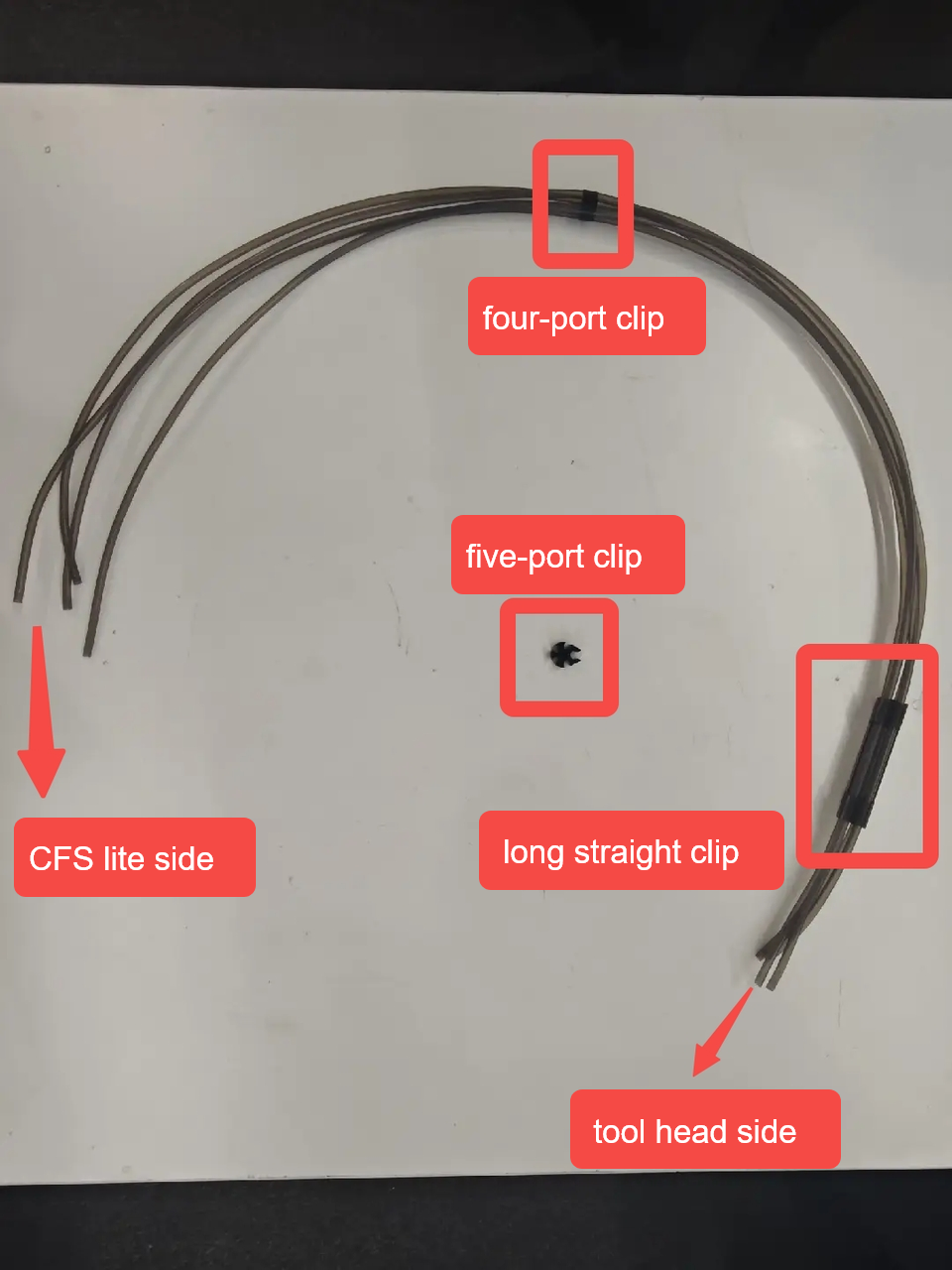 When inserting the PTFE tubes into the CFS lite , make sure to install the longer tubes (93 mm) in the left and right channels, and the shorter tubes (88 mm) in the middle channels.