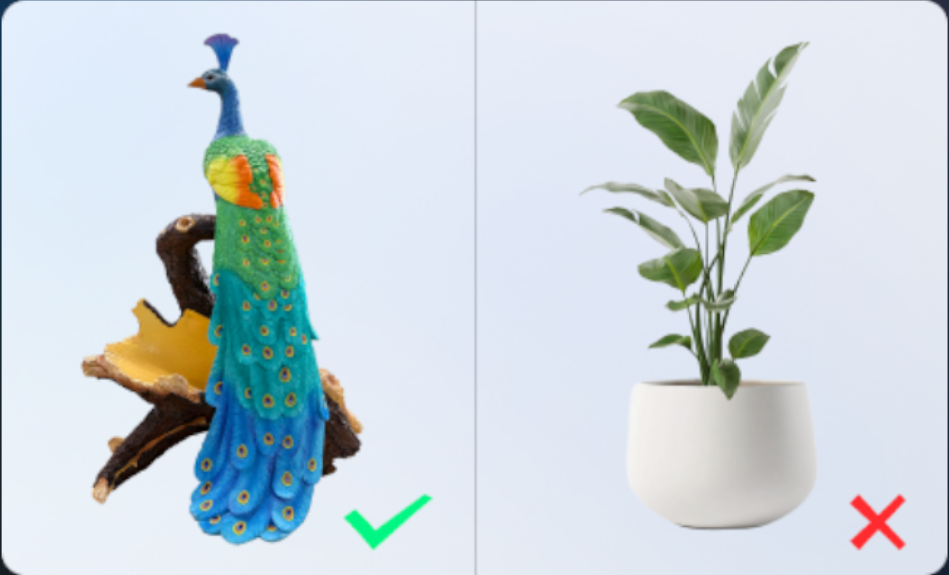 该功能不适用于柔性物体(如布料、花草等),这类材质容易产生微动;建议选择纹理清晰的刚性模型,弱纹理部分会导致效果不佳。