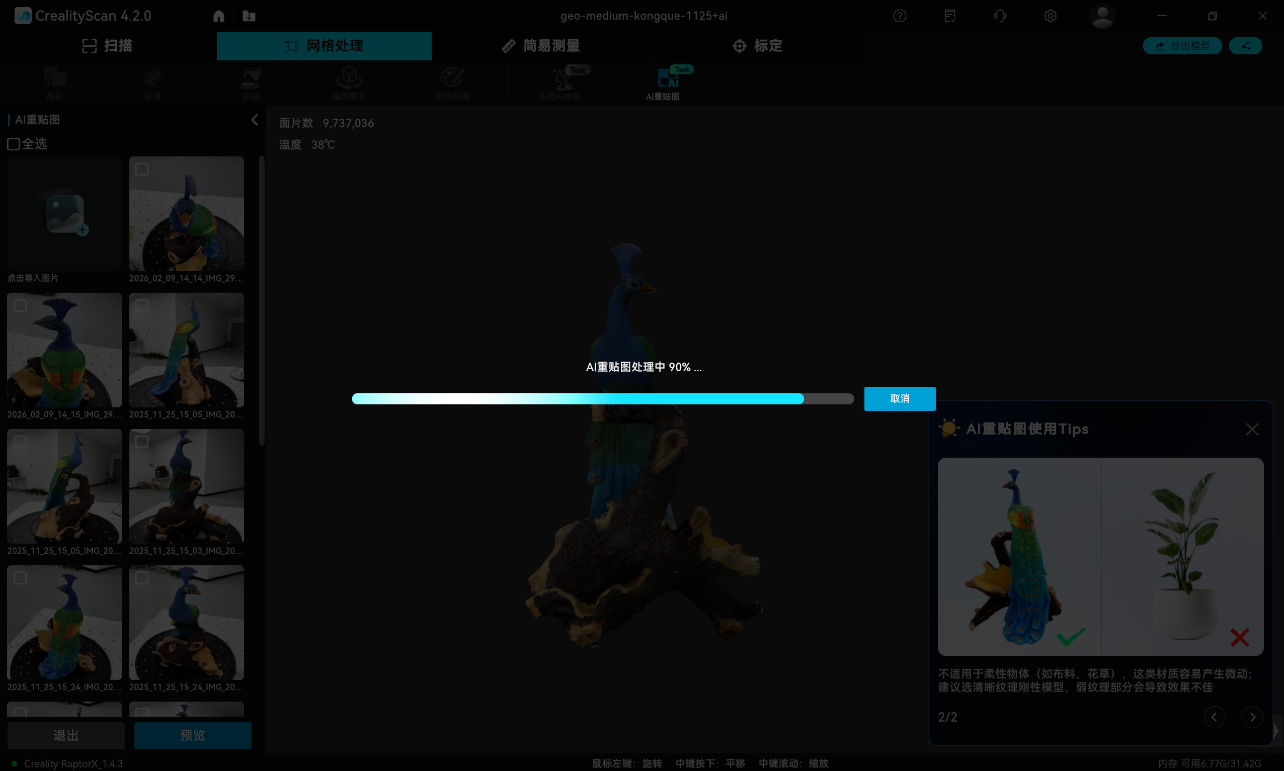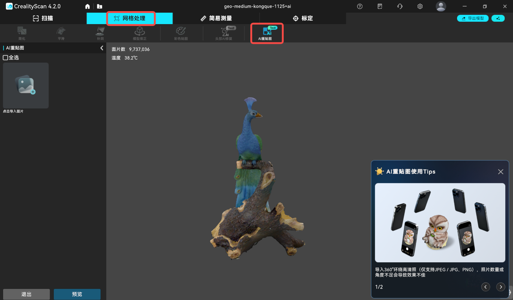 在CrealityScan软件中,打开需要进行AI重贴图的项目。注意:只有已完成彩色贴图处理的项目才能使用此功能。点击 网格处理 → AI重贴图。