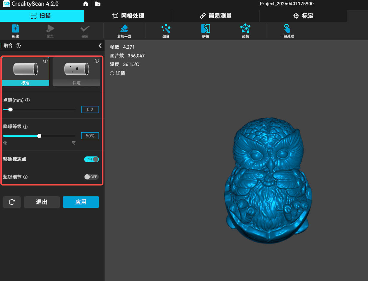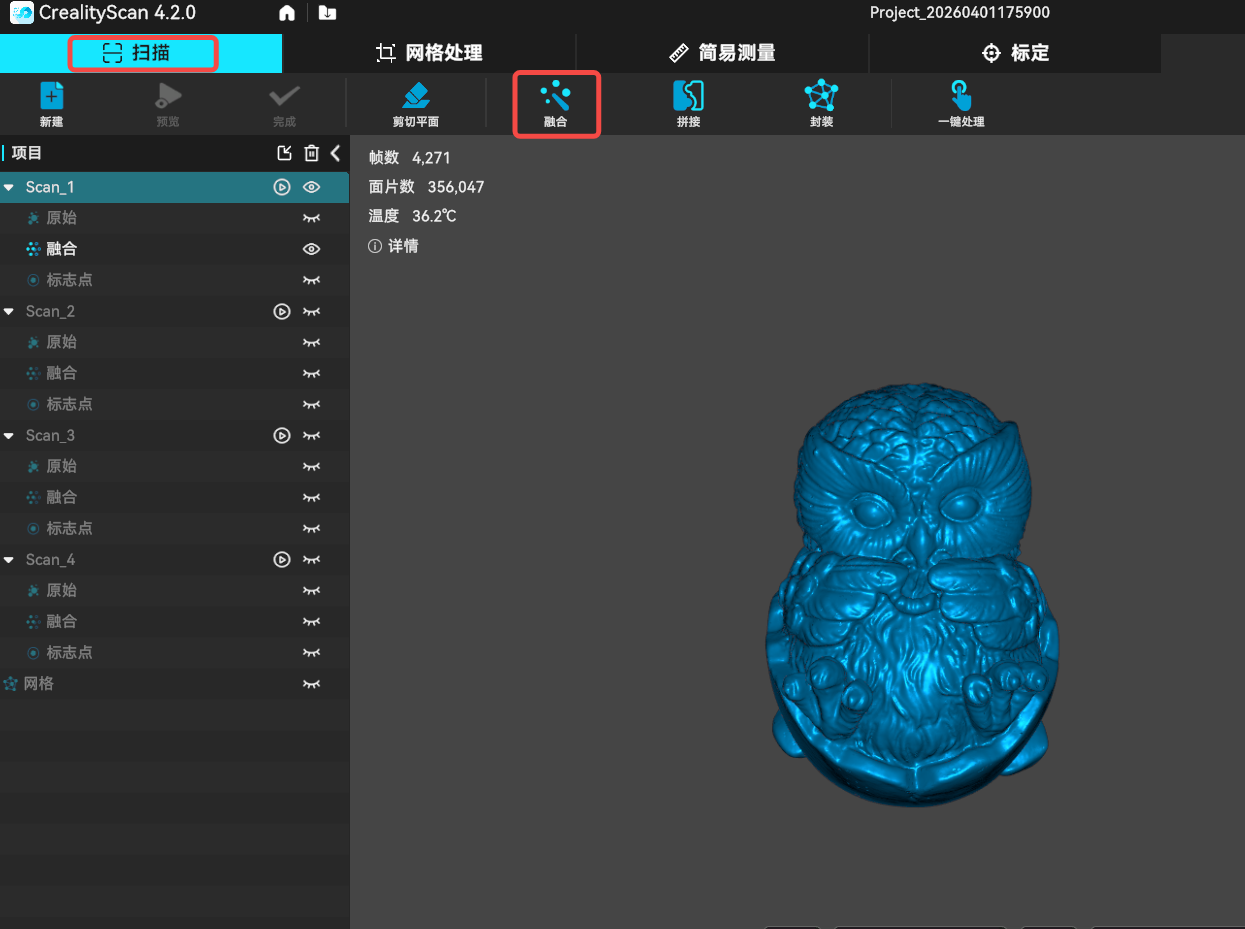 Creality Scan软件允许用户多次进行点云融合,例如,如果你对当前的融合结果不满意,可以修改参数并重新执行点云融合步骤。