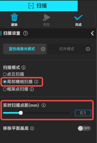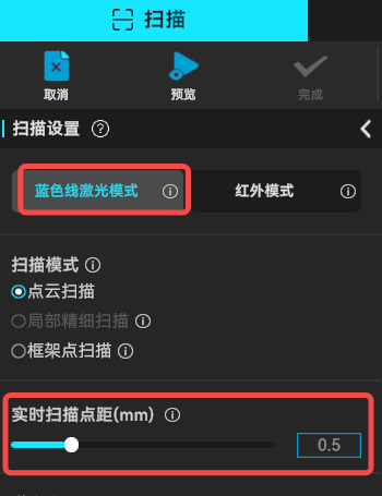 对于蓝色线激光模式,软件要求用户设置两种点距:实时扫描点距和点云融合的点距。