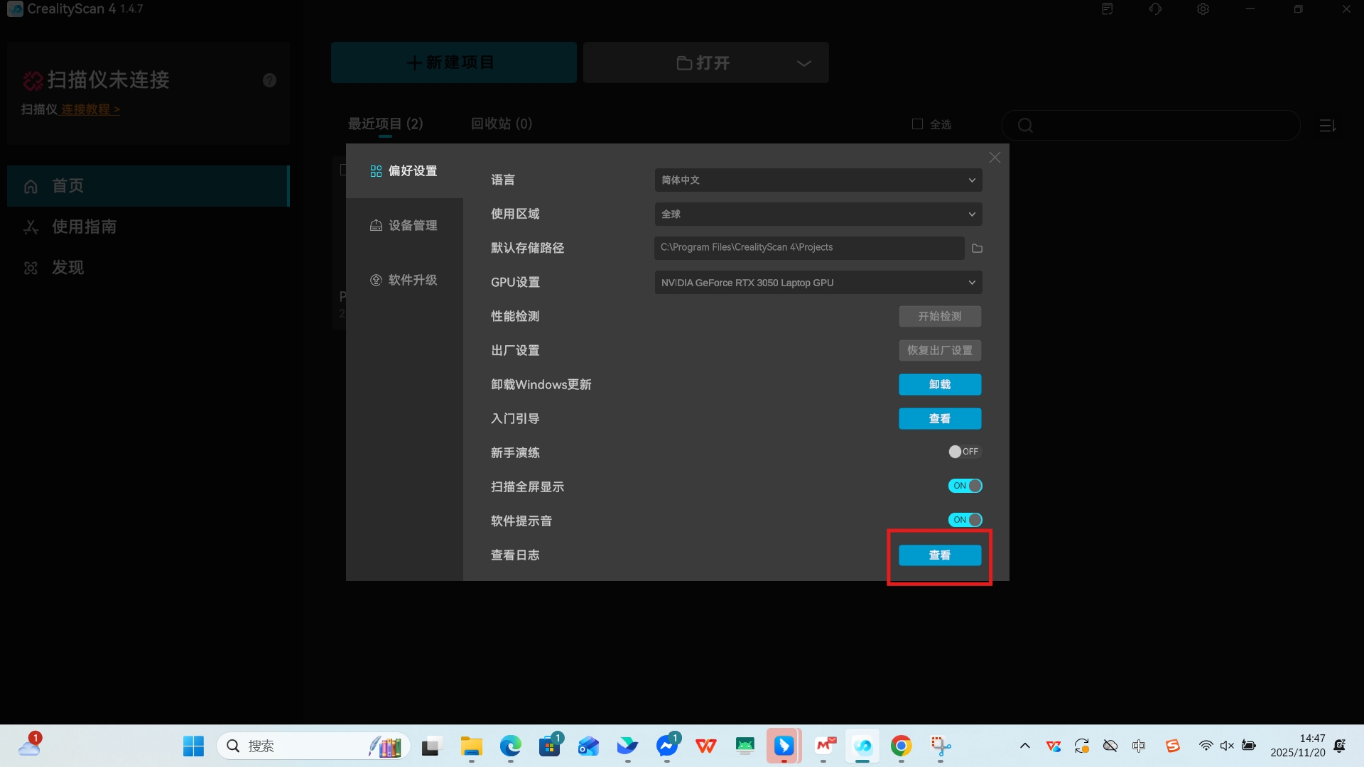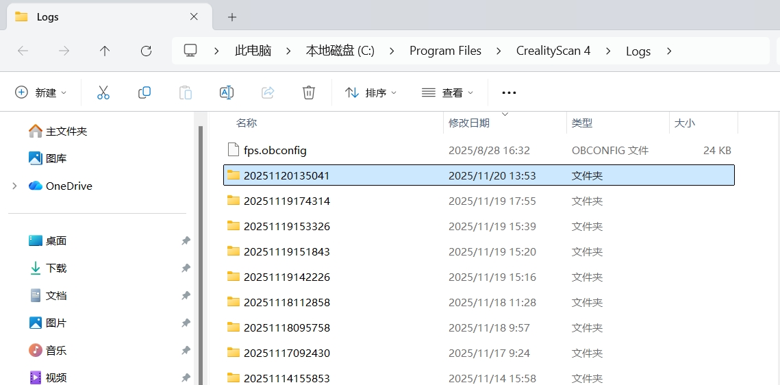 若为4.1.3.10之前版本,可从Go->Document->CrealityScan里,找到跟出现故障最近时间的scan_log、ScannerStreamSDK.log和alog.txt