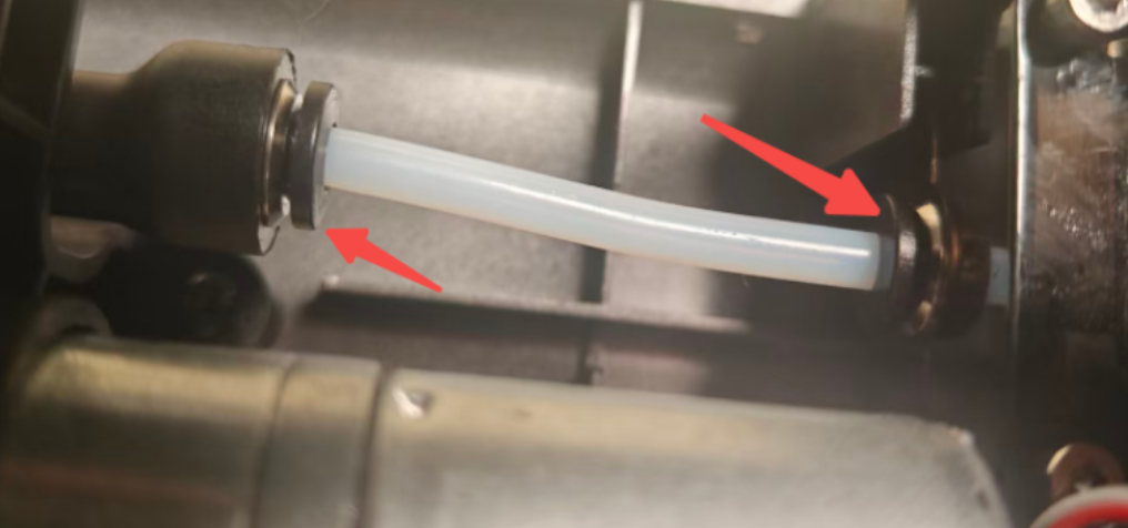 按住气动接头,将铁氟龙管取出,换上新的铁氟龙管安装回气动接头;然后依次固定紧三颗固定螺丝。