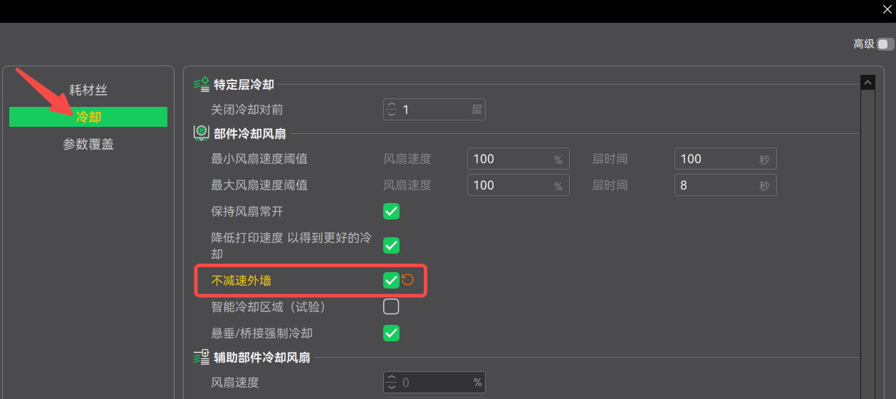 2. 选择“冷却”--勾选“不减速外墙”,保存后重新进行切片打印。如果已开启“不减速外墙”,无需操作。