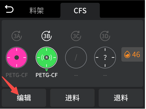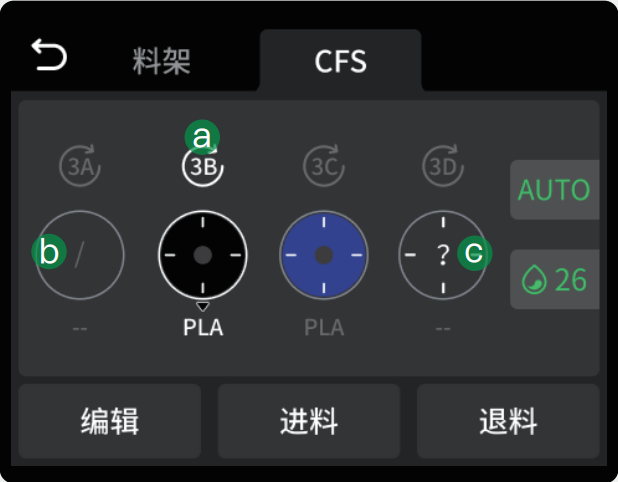 a为预上料按钮,可点击进行读取耗材,读取成功将会显示耗材余量和耗材颜色,读取失败将会显示耗材编辑按钮,此时耗材显示为?。