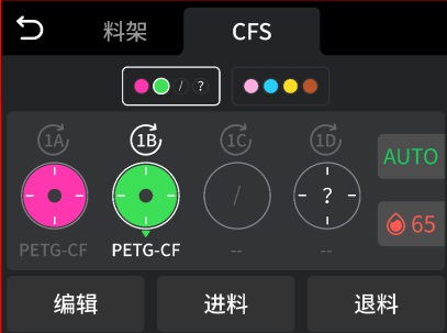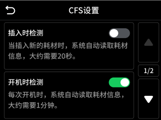 加载耗材:将耗材放入CFS中,将耗材头对准对应料仓铁氟龙管,轻轻推入,感受到拉力后放手,耗材将会自动上料。