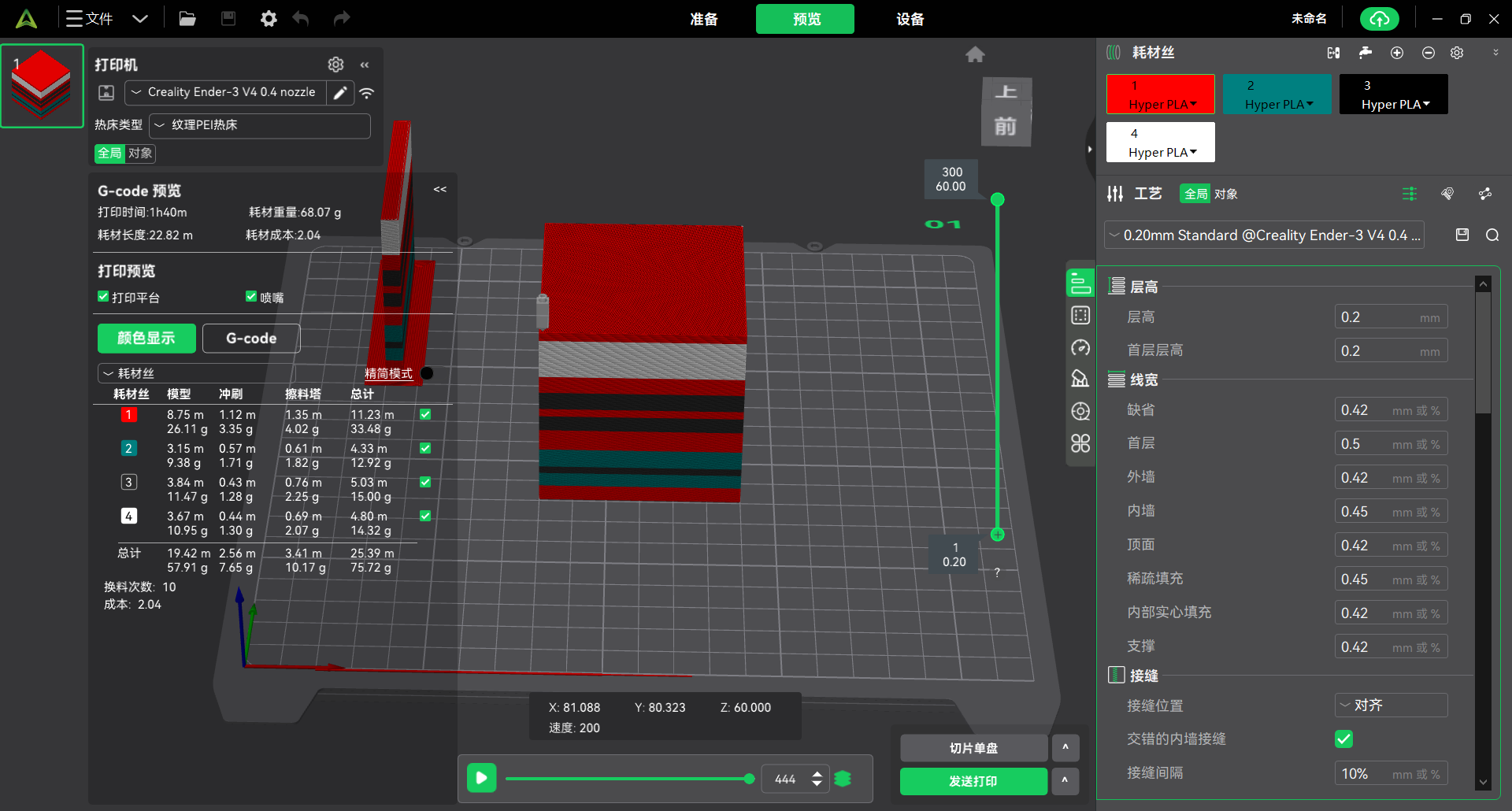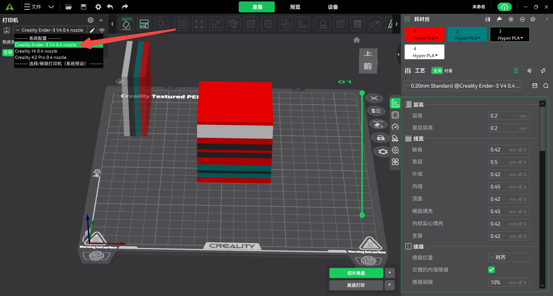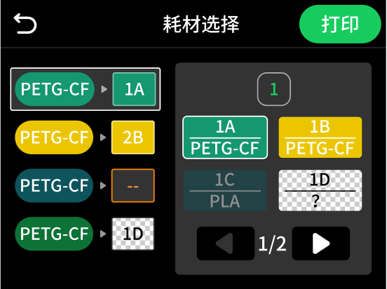 如下图,左侧为文件包含的材料颜色及类型。右侧文件到耗材仓映射状态。