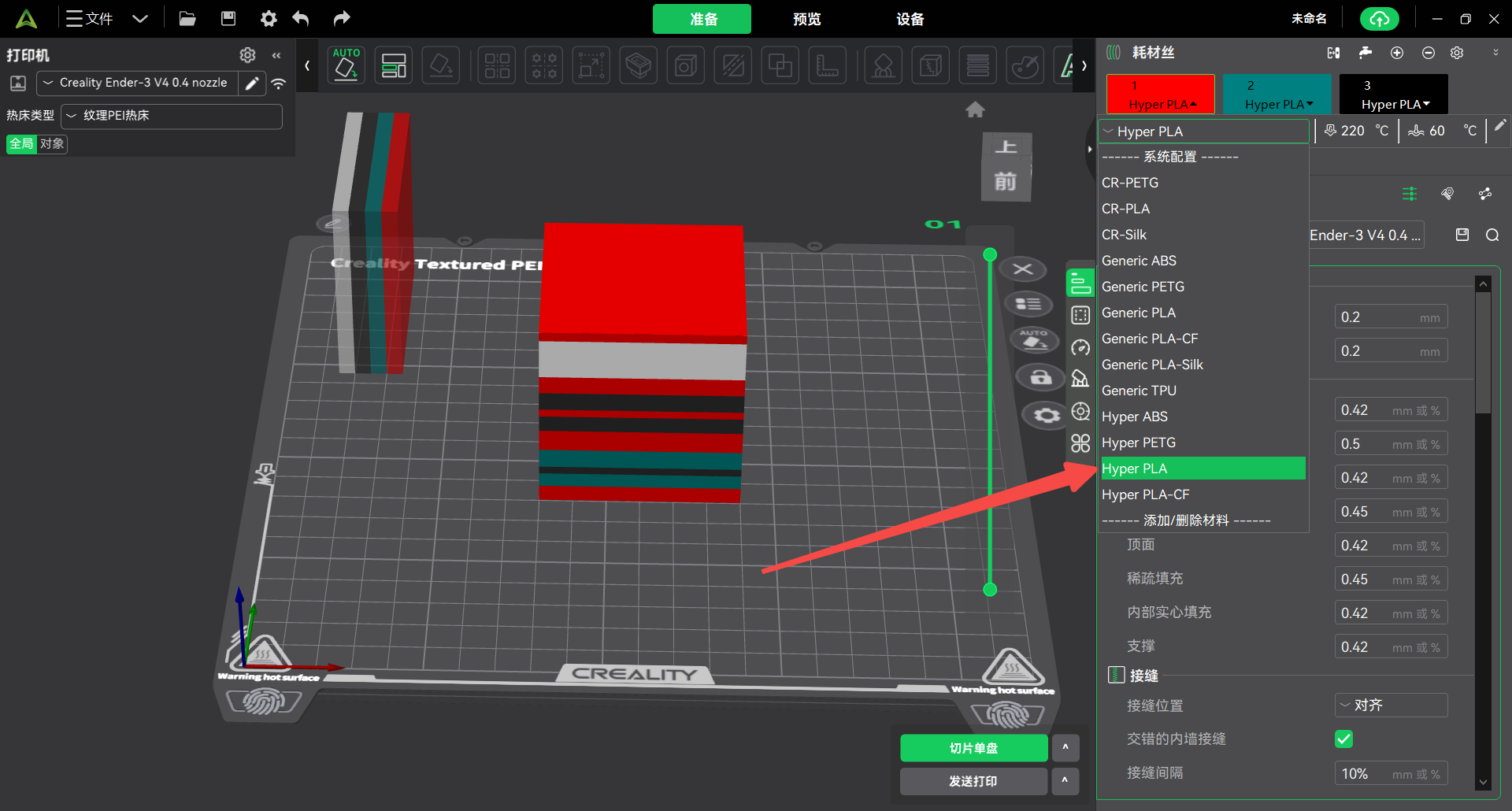 更改耗材为HyperPLA或要使用打印的对应耗材种类