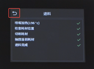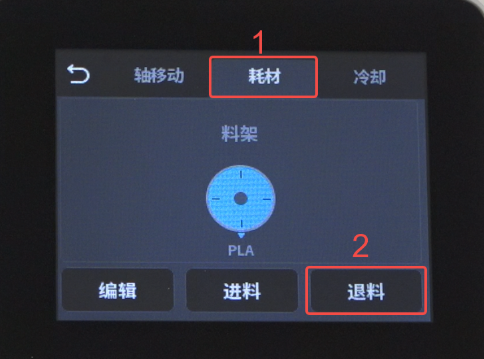 点击“准备”—"耗材"—”退料",等待退料完,点击“返回”返回桌面