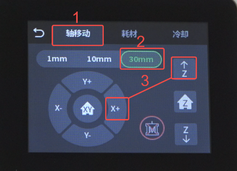 点击“返回”—“轴移动”—“30mm”—“XZ轴”,将工具头向上移动,空出操作空间