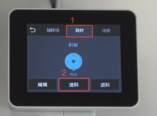 点击“准备”—“耗材”—“进料”—”确定“,注意:确认装载的耗材与设置的耗材参数匹配