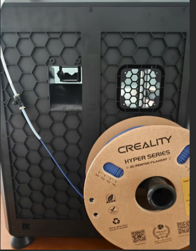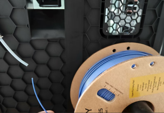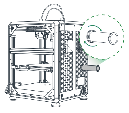 3. 耗材挂至料架筒,手动输送耗材至打印头位置。按住黑色气动塞,拔出铁氟龙管。