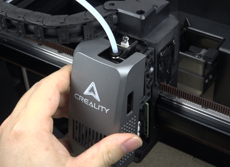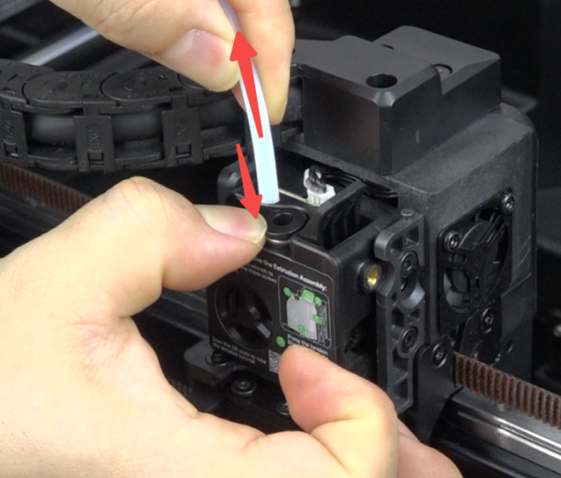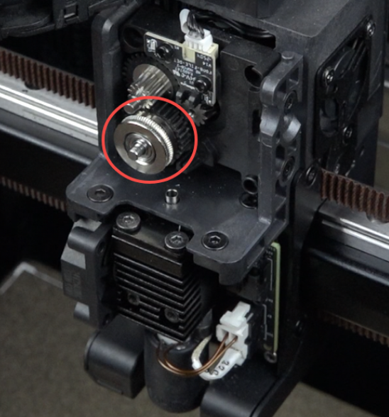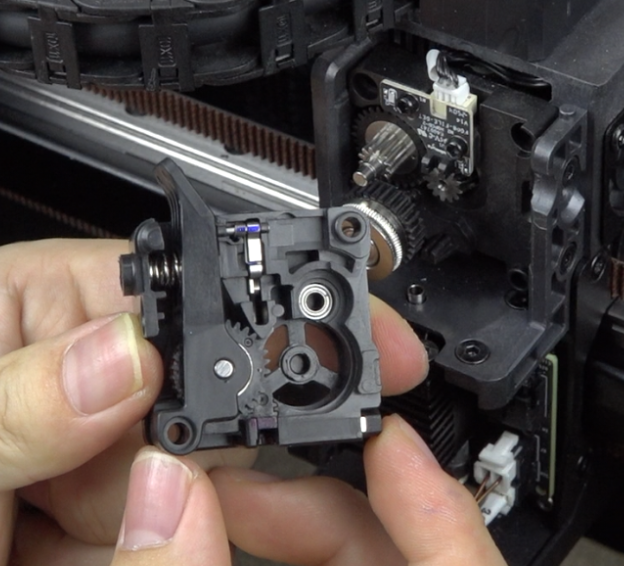 放置挤出齿轮,捏住挤出夹,安装挤出前壳。