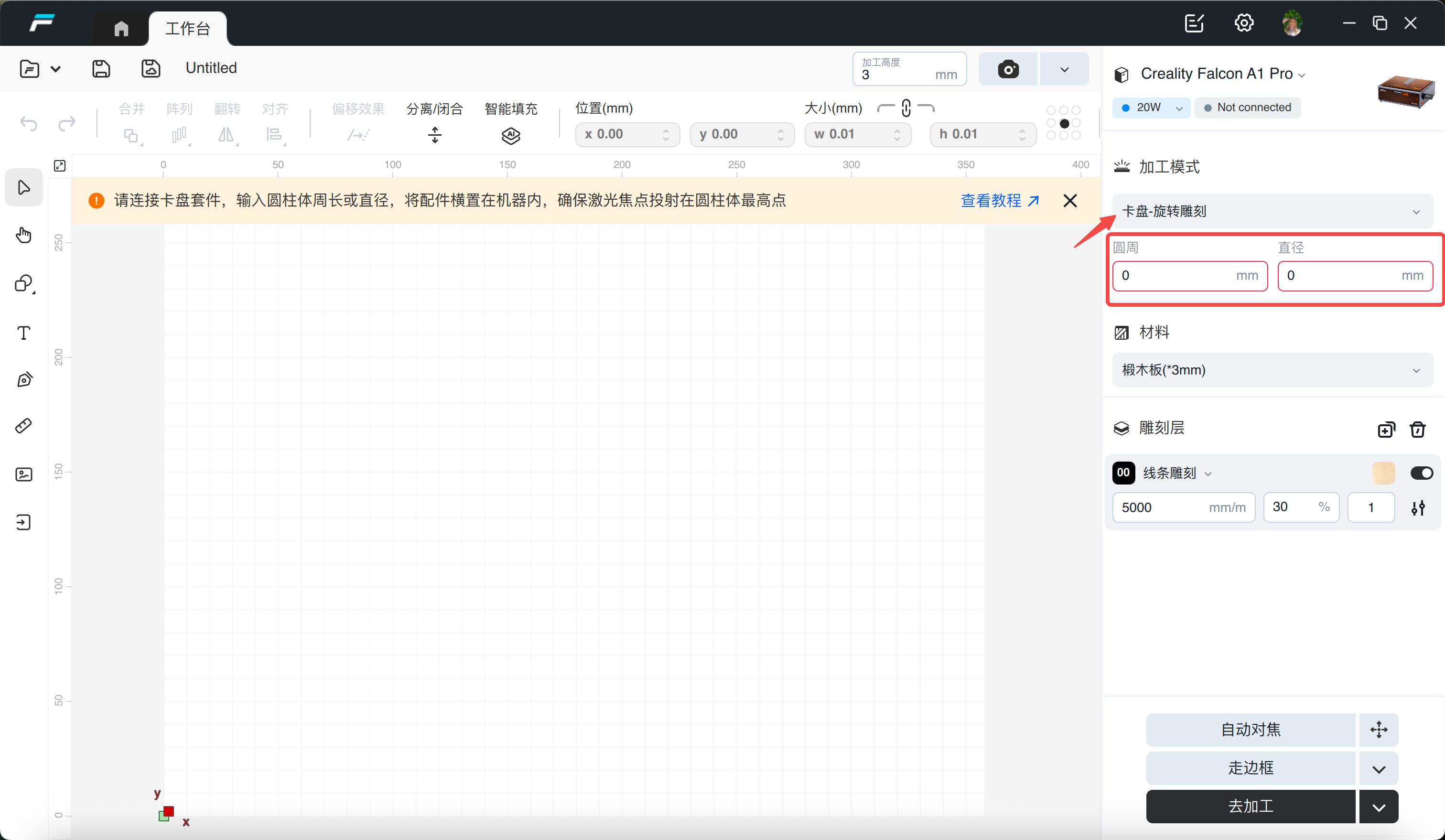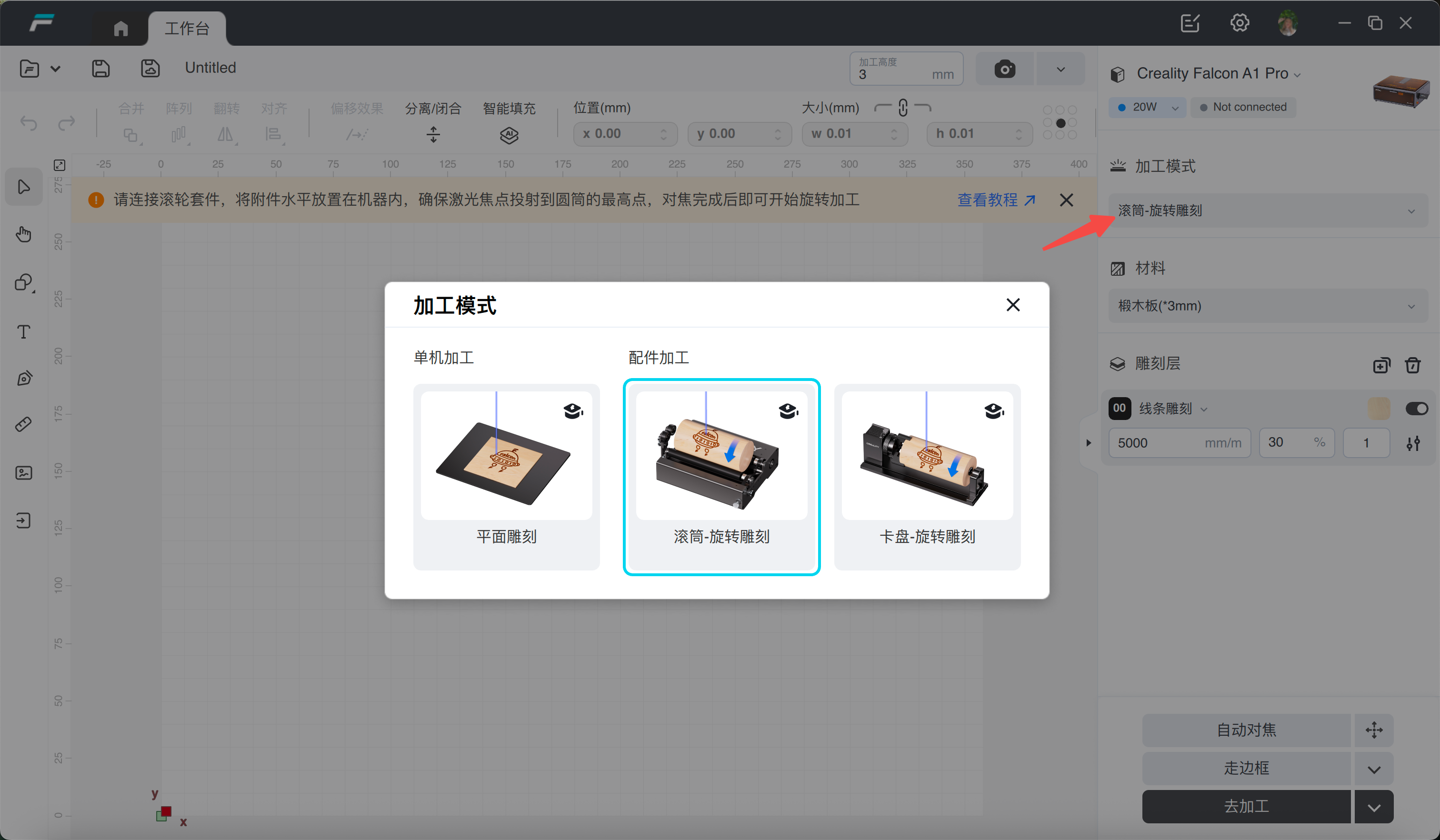 1、软件中选择"旋转加工"模式,根据所使用的旋转配件型号,选择对应的"滚轮套件"或者"卡盘套件"
